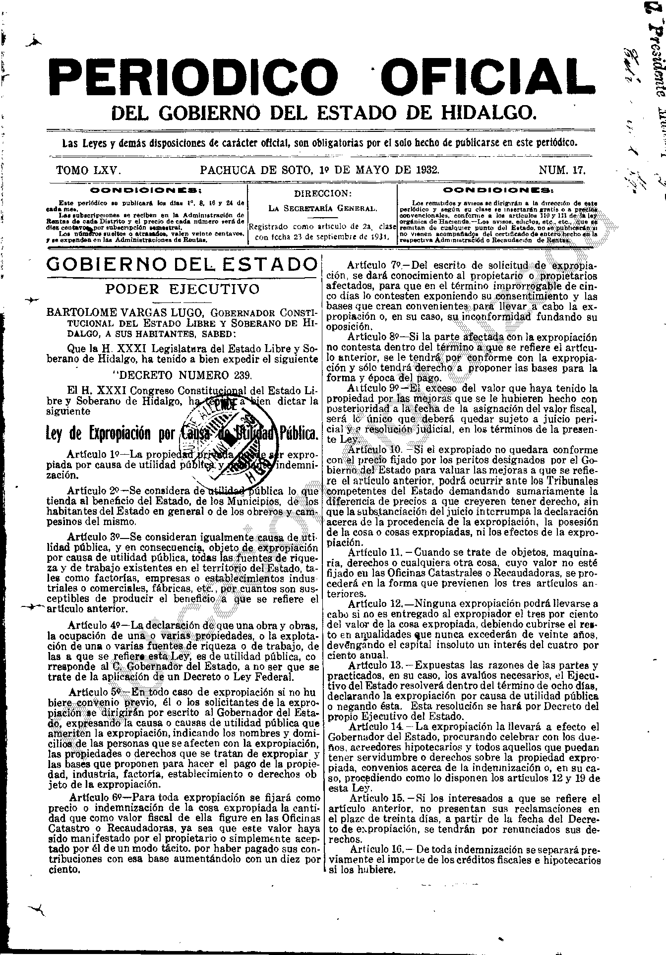 - Decreto Número 239, El H. XXXI Congreso Constitucional del Estado Libre y Soberano de Hidalgo, ha tenido a bien dictar la siguiente: LEY DE EXPROPIACION POR CAUSA DE UTILIDAD PUBLICA.