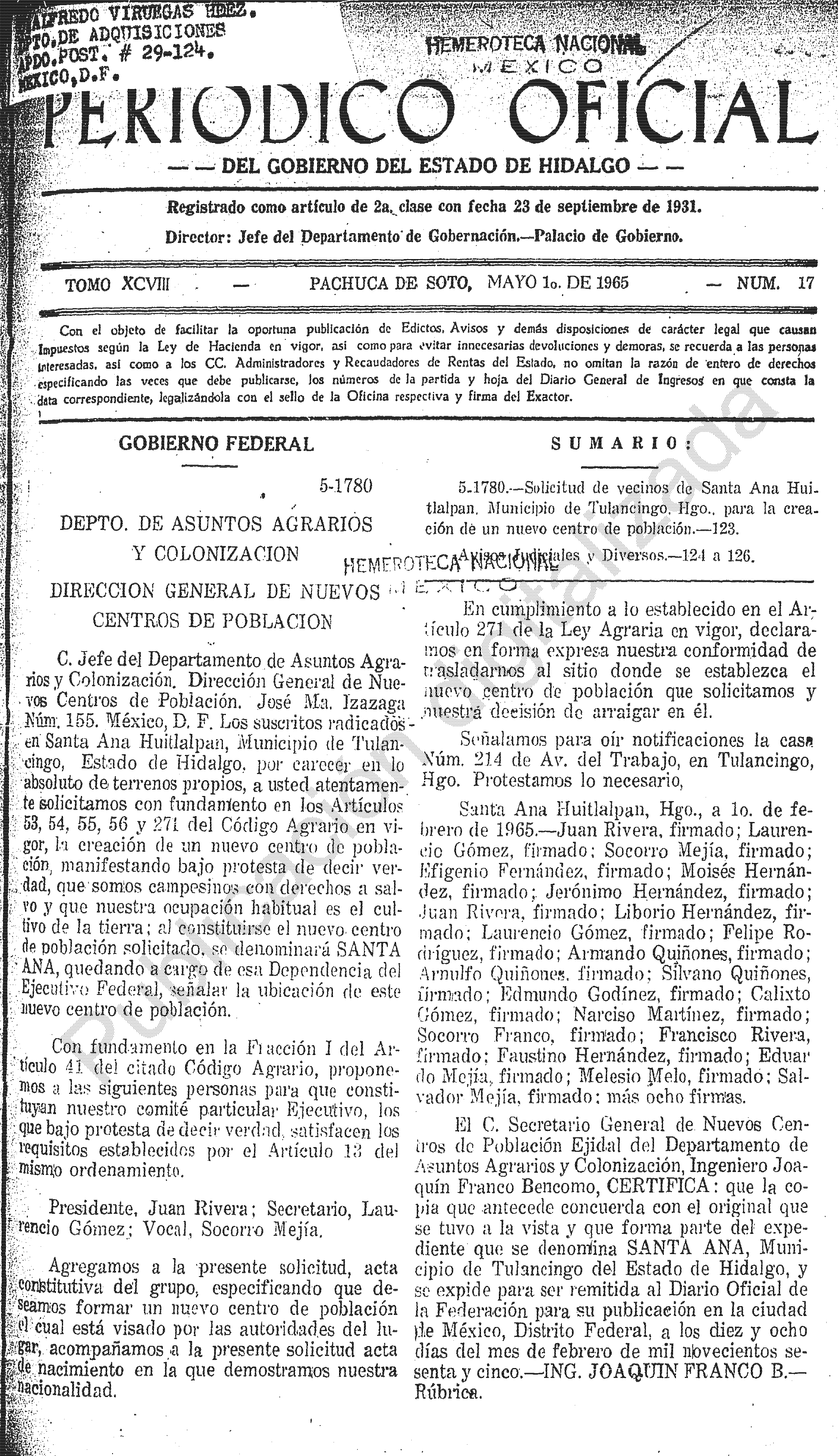 - 5-1780.- Solicitud de vecinos de Santa Ana Huitlalpan, Municipio de Tulancingo, Hgo., para la creación de un nuevo centro de población.