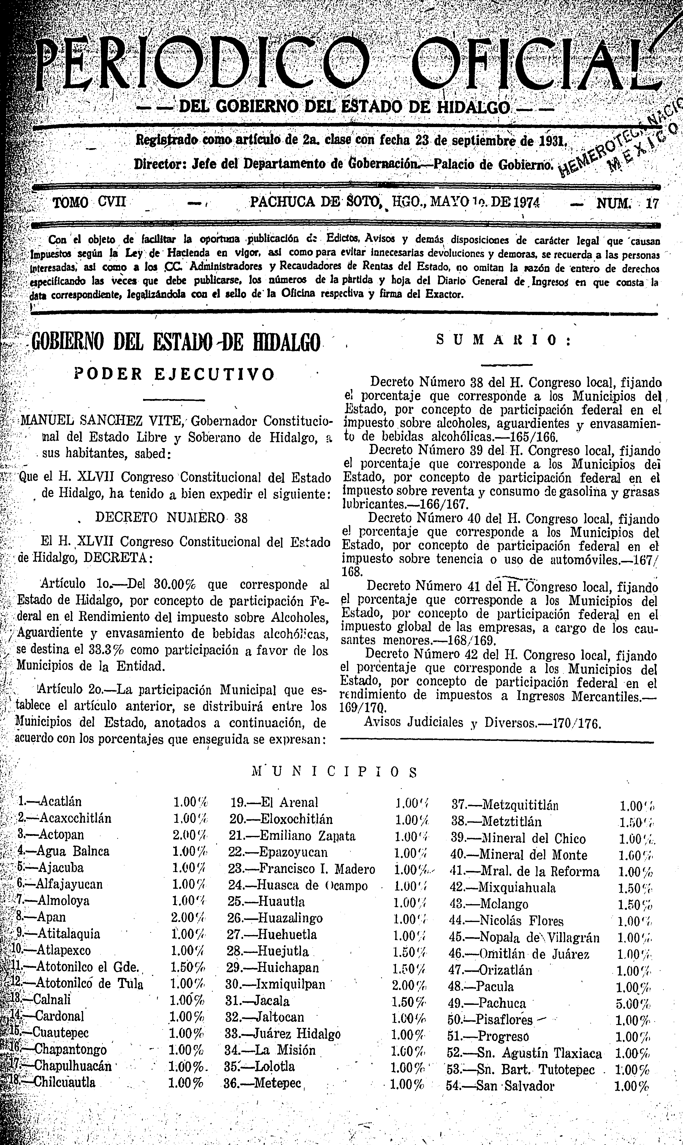 - Decreto Número 38 del H. Congreso local, fijando el porcentaje que corresponde a los Municipios del Estado, por concepto de participación federal en el impuesto sobre alcoholes, aguardientes y envasamiento de bebidas alcohólicas.