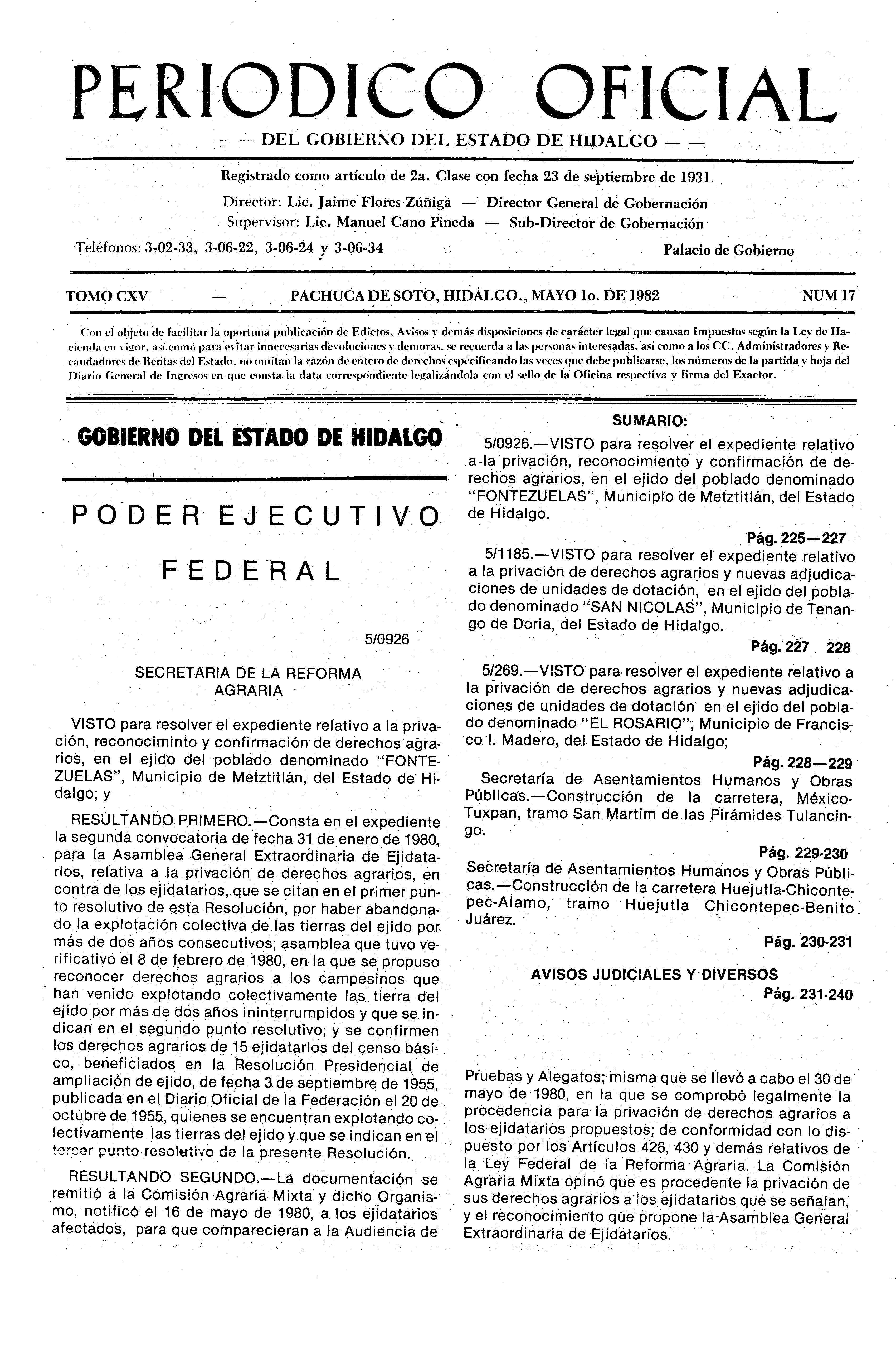 - 5/0926.- VISTO para resolver el expediente relativo a la privación, reconocimiento y confirmación de derechos agrarios, en el ejido del poblado denominado “FONTEZUELAS”, municipio de Metztitlán,del Estado de Hidalgo.
