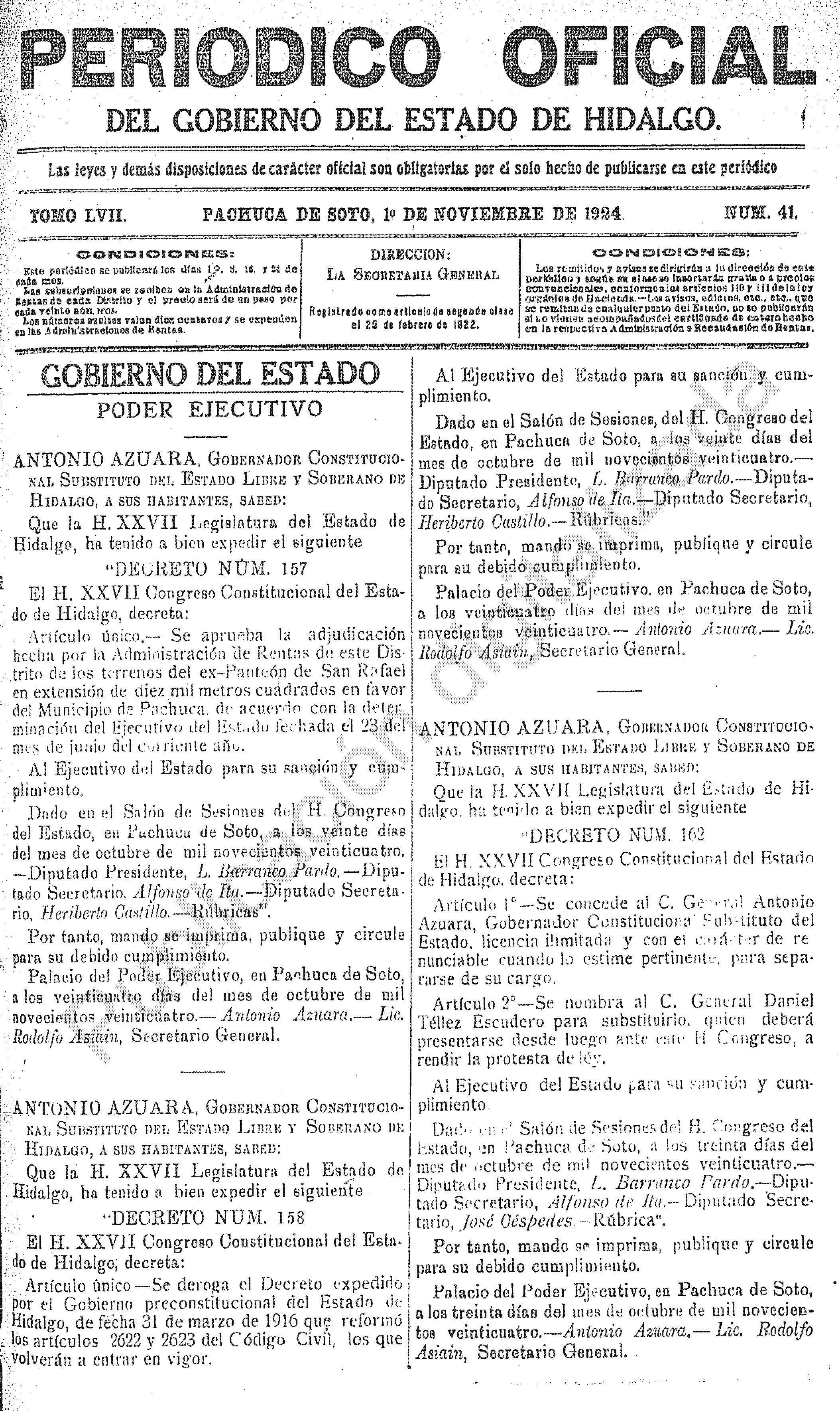 - -Poder Ejecutivo.- Antonio Azuara, Gobernador Constitucional, “Decreto número 158: Se deroga el Decreto expedido por el Gobierno preconstitucional del Estado de Hidalgo.