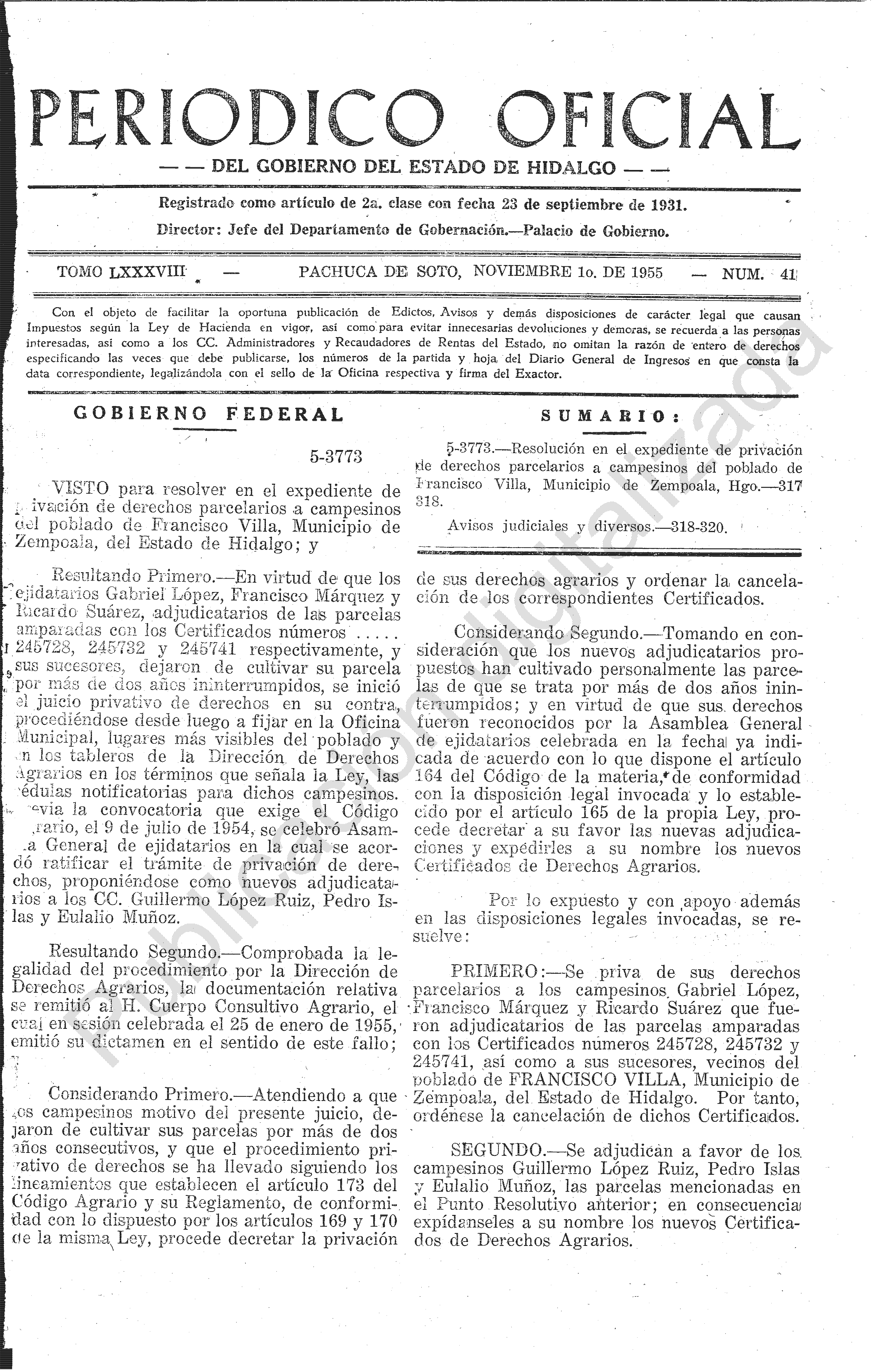 • 5-3773.- Resolución en el expediente de privación de derechos parcelarios a campesinos del poblado de Francisco Villa, Municipio de Zempoala, Hgo.