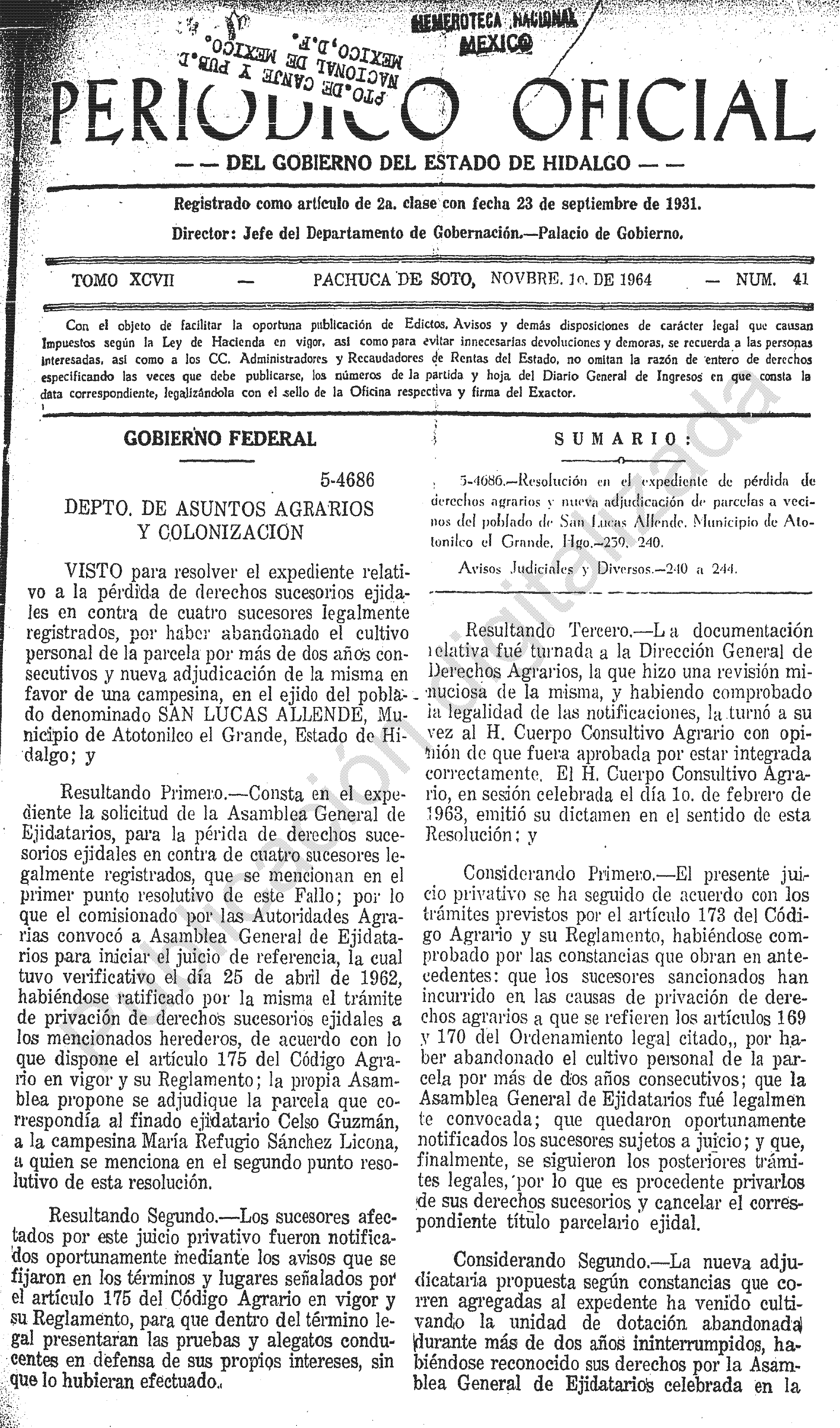 - 5-4686.- Resolución en el expediente de pérdida de derechos agrarios y nueva adjudicación de parcelas a vecinos del poblado de San Lucas Allende, Municipio de Atotonilco el Grande, Hgo.