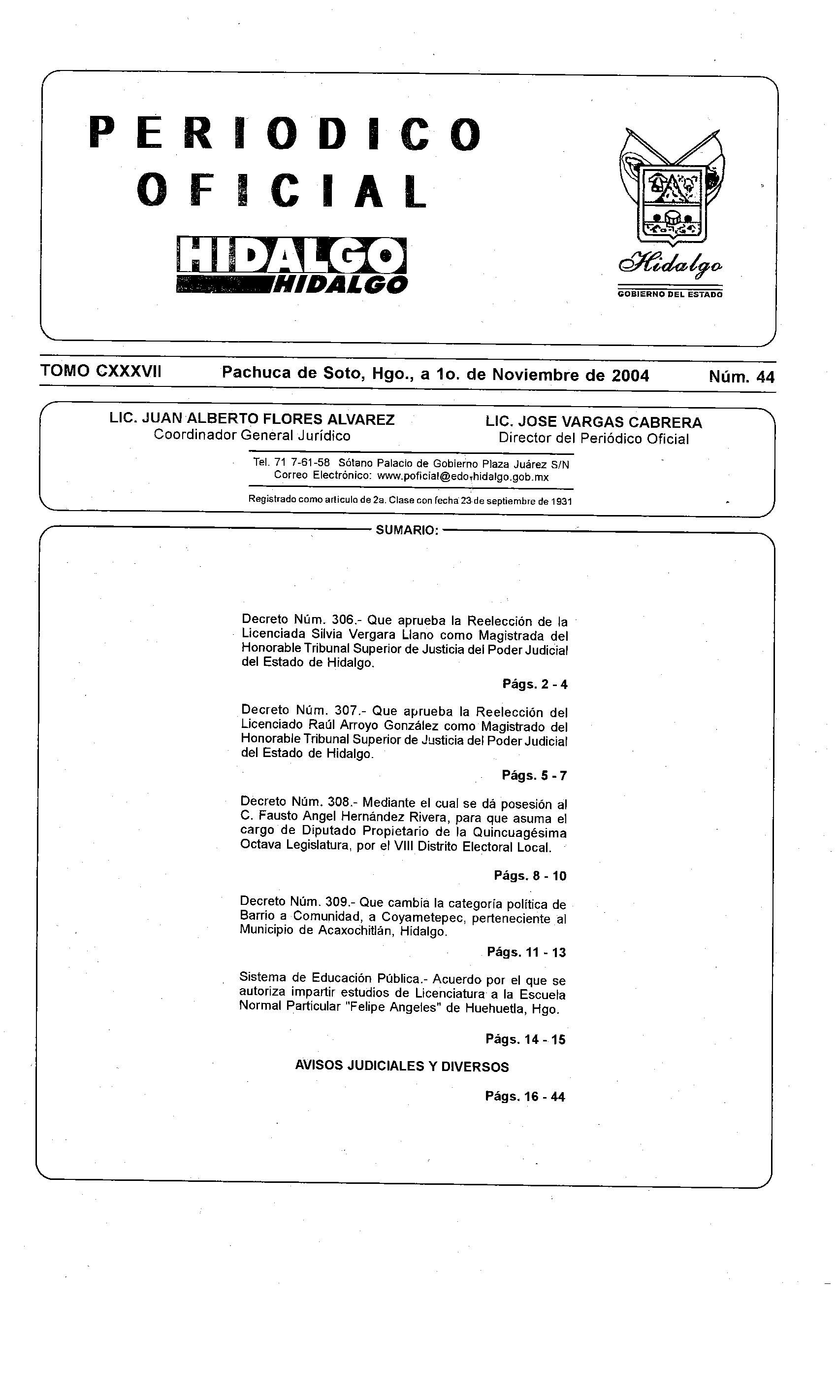 - Decreto Núm. 306.- Que aprueba la Reelección de la Licenciada Silvia Vergara Llano como Magistrada del Honorable Tribunal Superior de Justicia del Poder Judicial del Estado de Hidalgo.