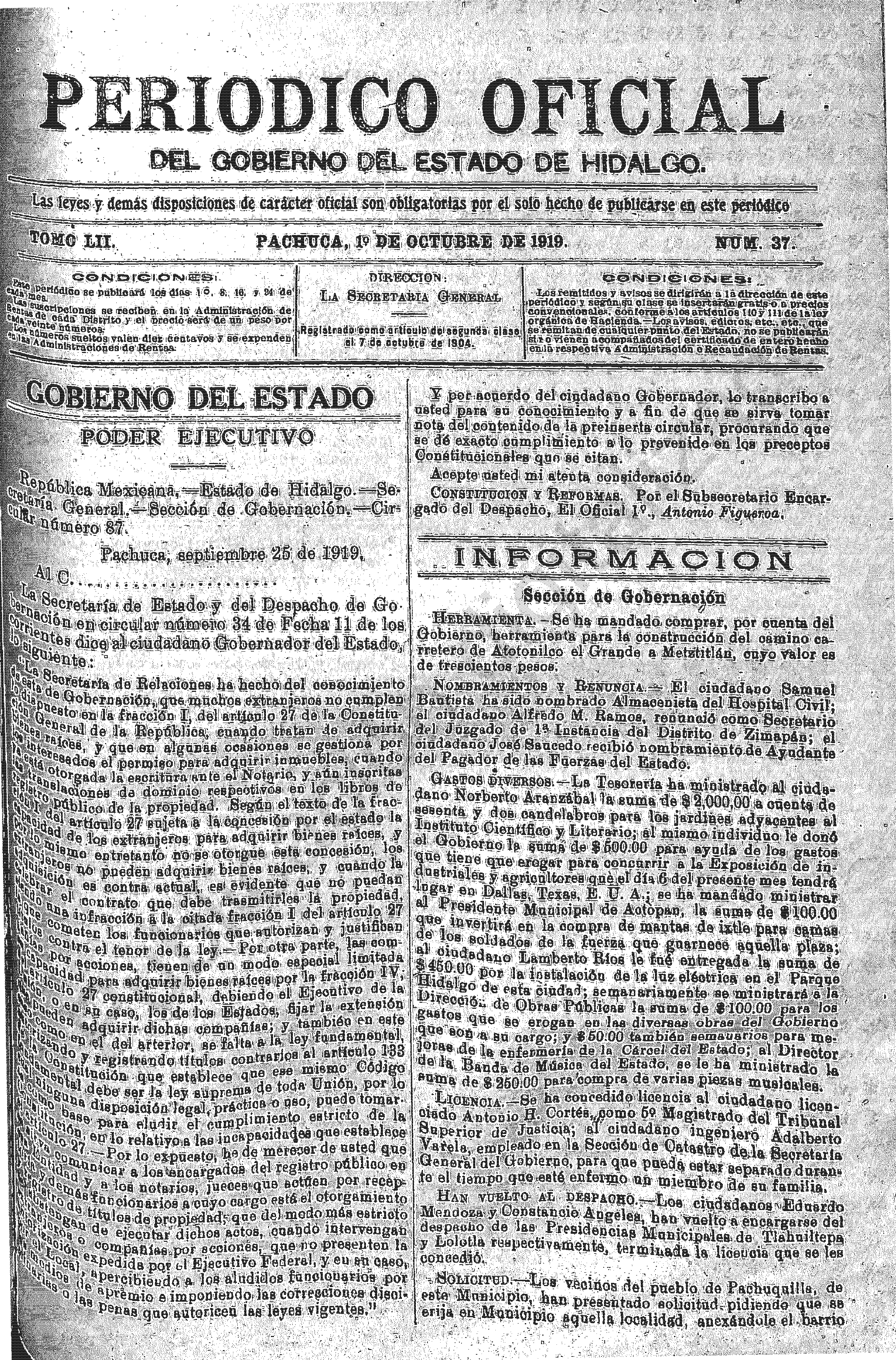 Periódico Oficial Ordinario 0 del 01 de octubre de 1919