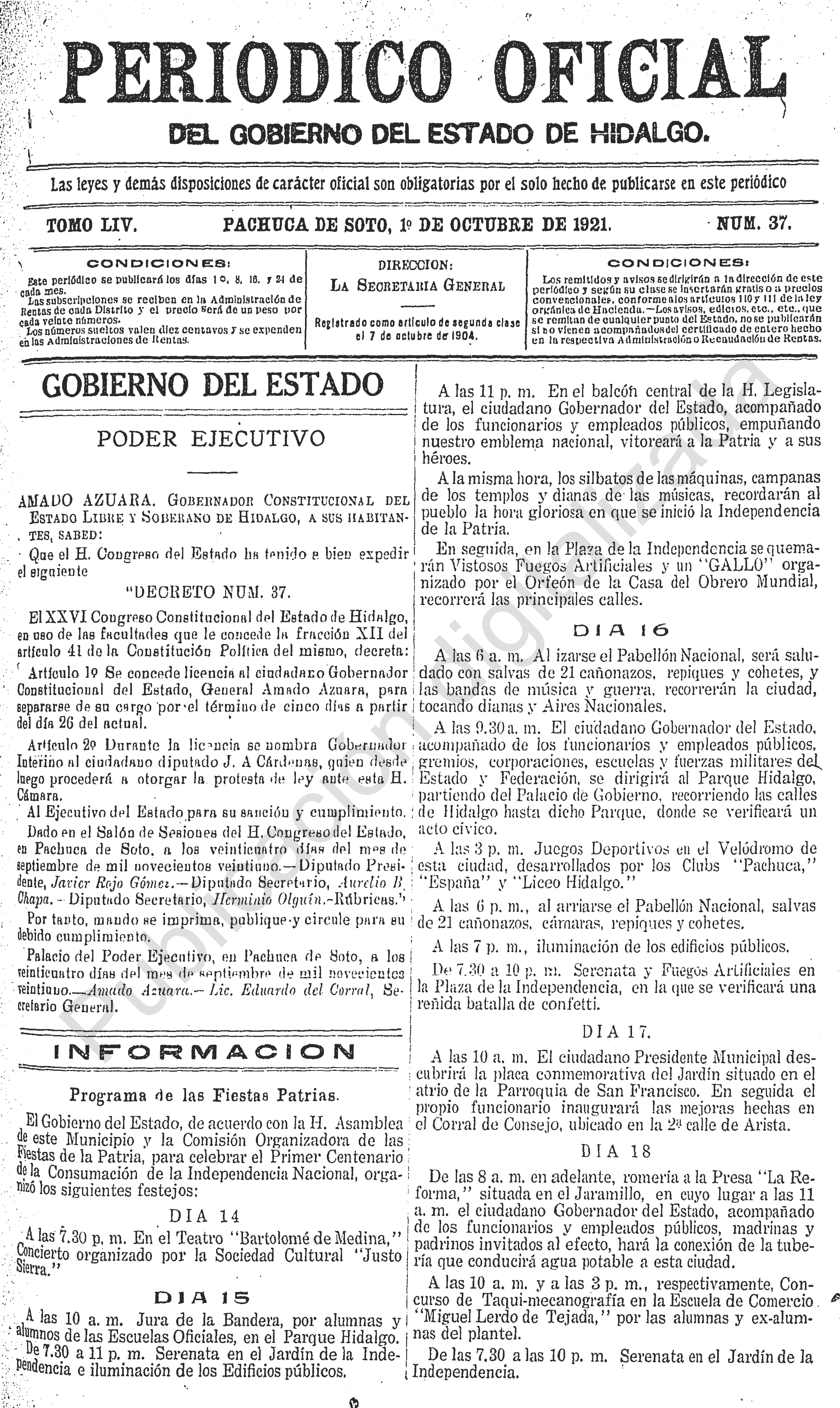 Descargar Periódico Oficial Ordinario 0 del 01 de octubre de 1921El portal web del Periódico Oficial del Estado de hidalgo es el único medio de difusión oficial del Gobierno del Estado de Hidalgo