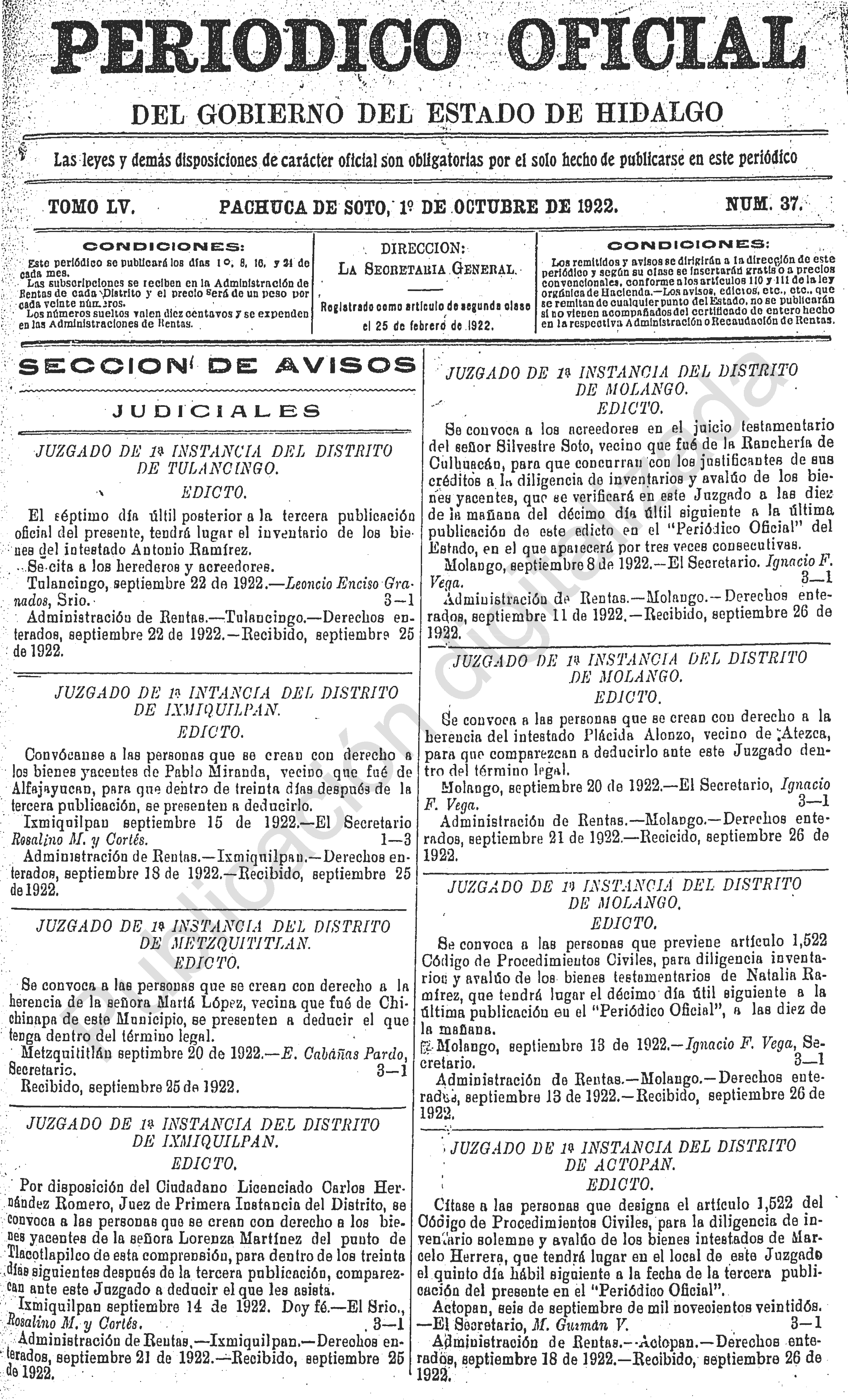 Descargar Periódico Oficial Ordinario 0 del 01 de octubre de 1922El portal web del Periódico Oficial del Estado de hidalgo es el único medio de difusión oficial del Gobierno del Estado de Hidalgo