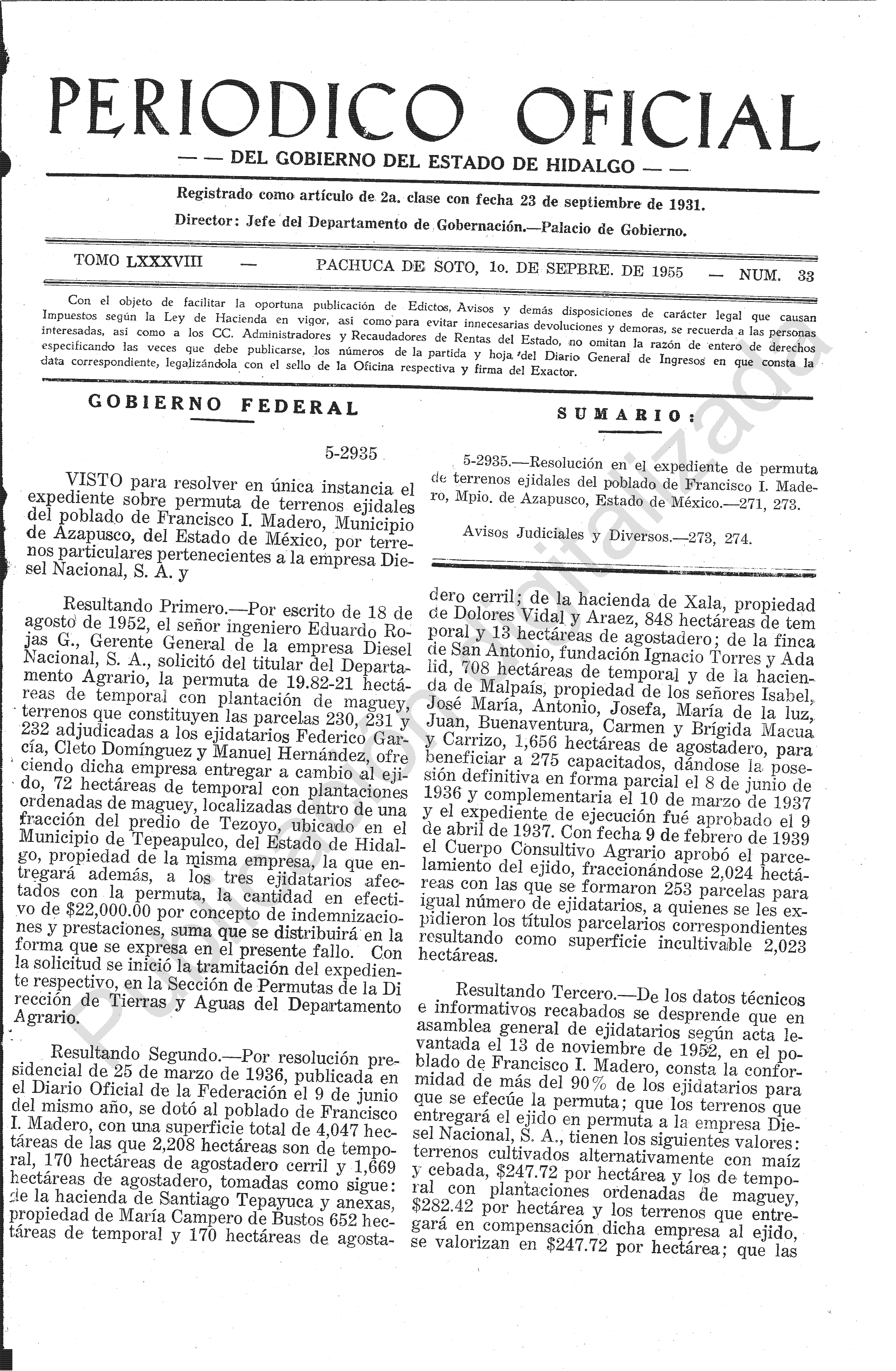 - 5-2935.- Resolución en el expediente de permuta de terrenos ejidales del poblado de Francisco I. Madero, Mpio. de Azapusco, Estado de México.
