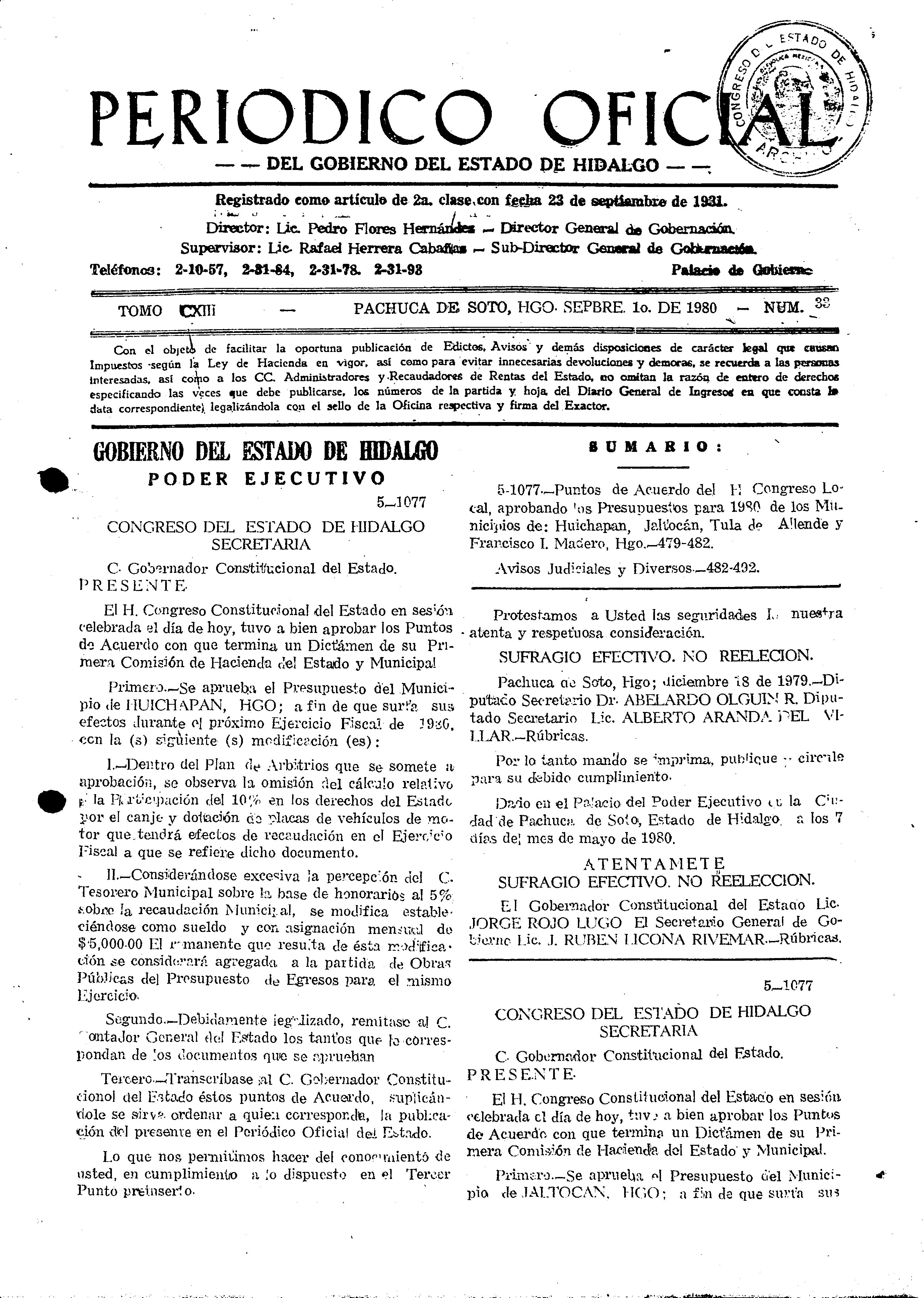 Descargar Periódico Oficial Ordinario 0 del 01 de septiembre de 1980