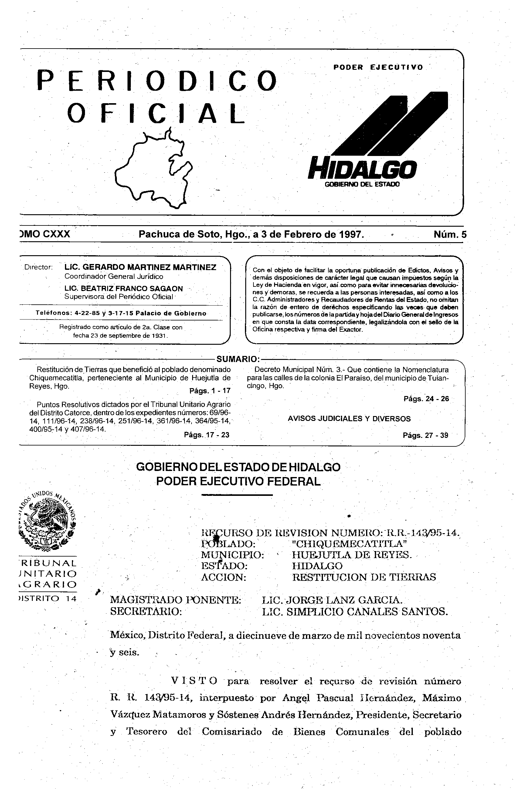 Descargar Periódico Oficial Ordinario 0 del 03 de febrero de 1997