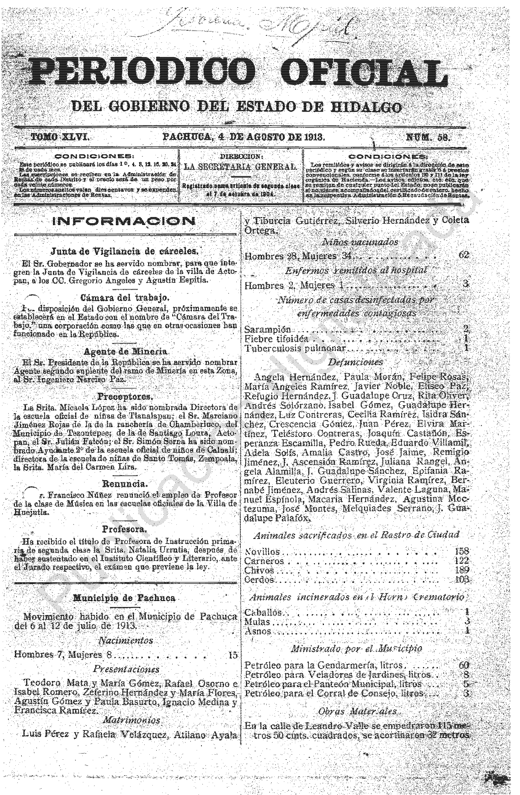 Descargar Periódico Oficial Ordinario 0 del 04 de agosto de 1913Tamaño 1.25 MB