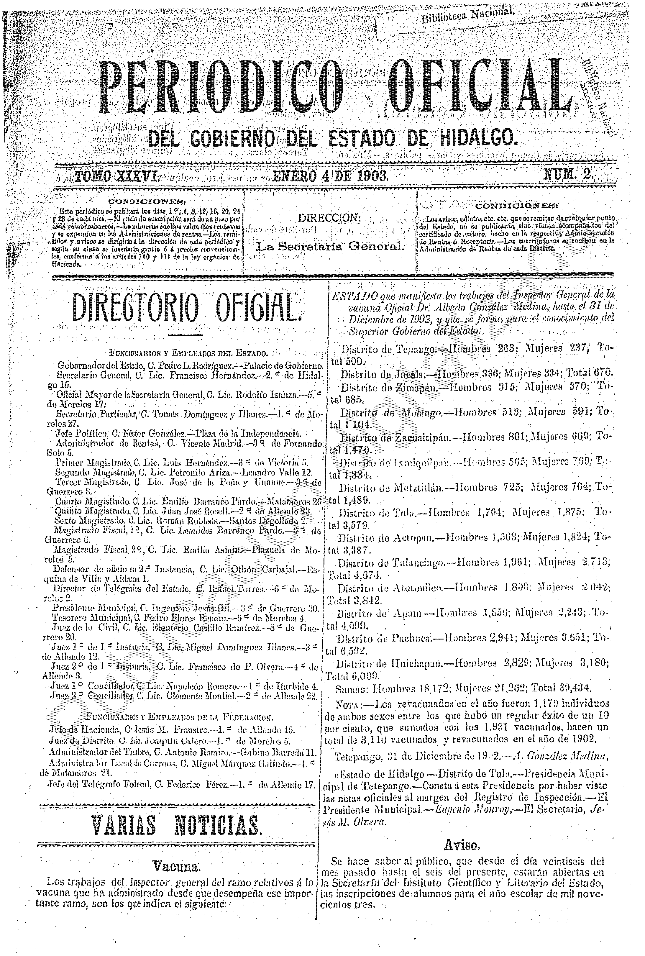 Descargar Periódico Oficial Ordinario 0 del 04 de enero de 1903El portal web del Periódico Oficial del Estado de hidalgo es el único medio de difusión oficial del Gobierno del Estado de Hidalgo