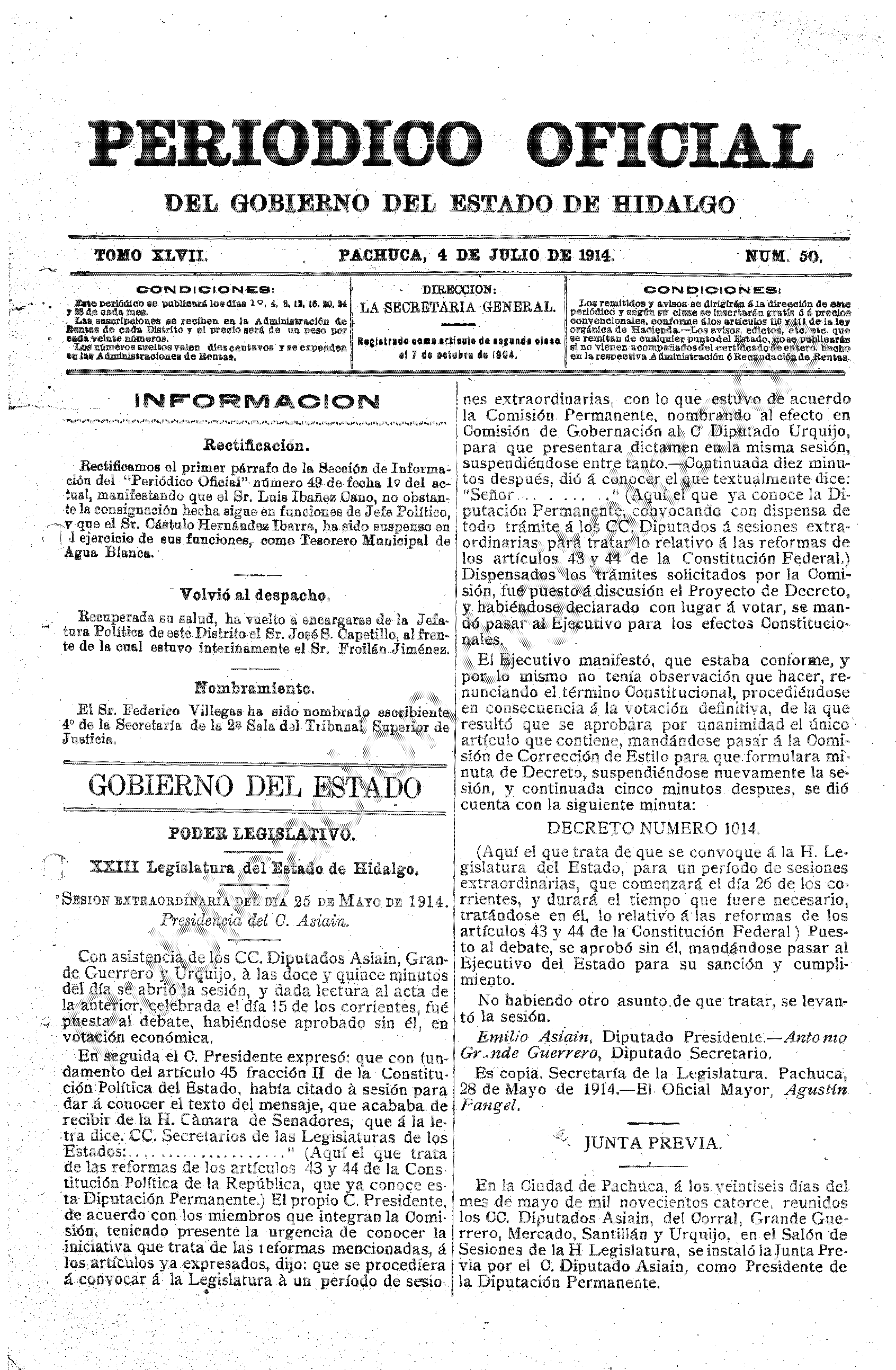 - Gobierno Federal XXIII Legislatura del Estado de Hidalgo Decreto Número 1014 por el cual se convoque a la H. Legislatura del Estado para periodo de Sesión Extraordinario