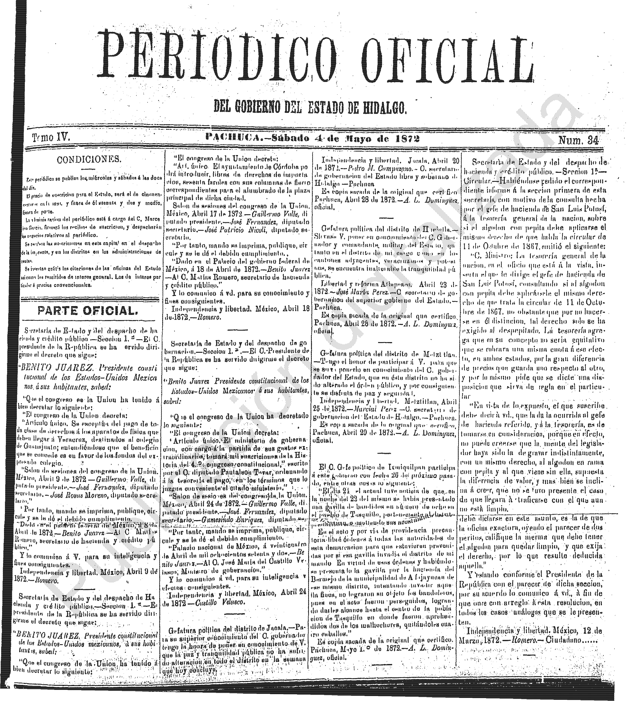Descargar Periódico Oficial Ordinario 0 del 04 de mayo de 1872Tamaño 607.30 KB