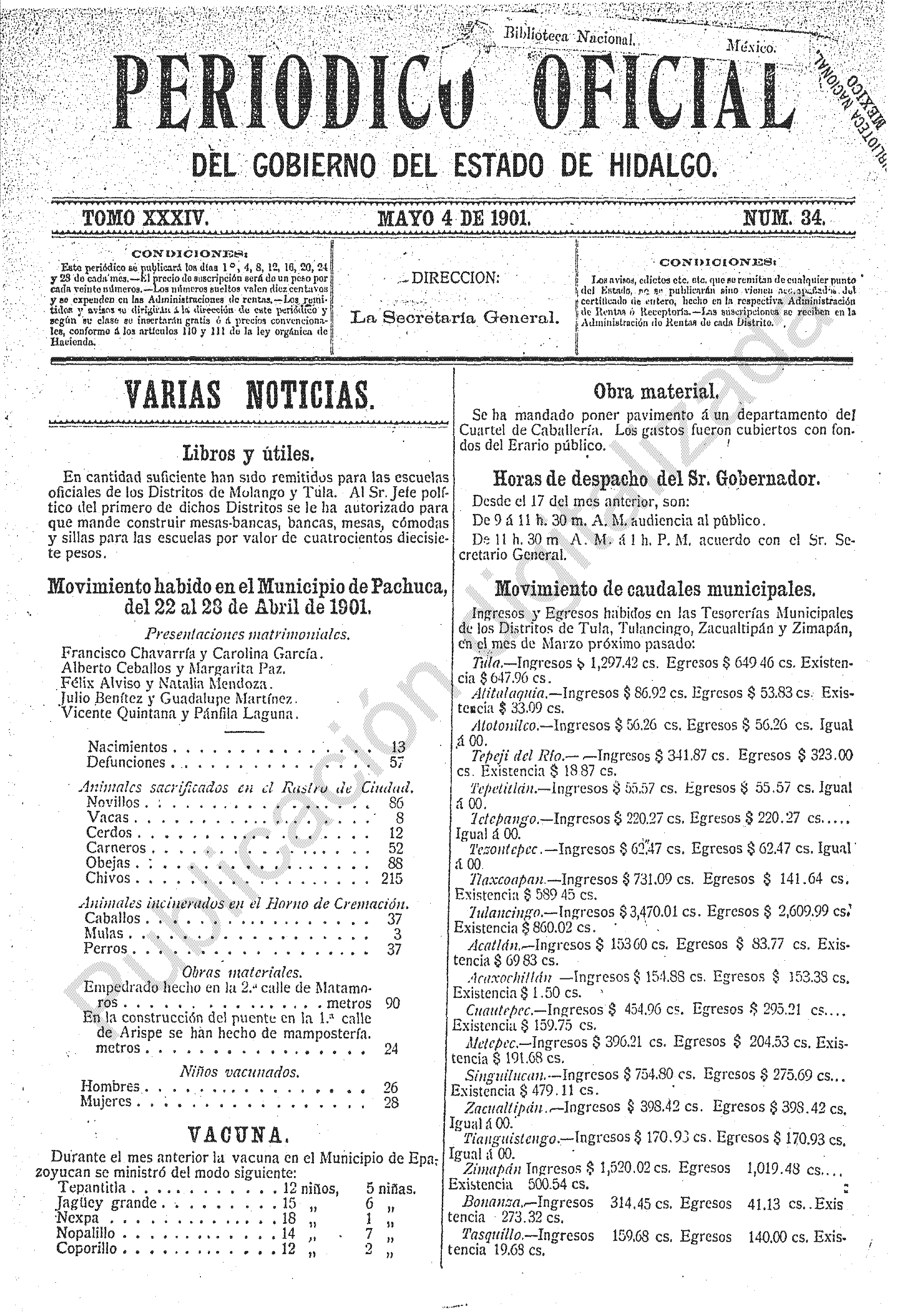 Descargar Periódico Oficial Ordinario 0 del 04 de mayo de 1901Tamaño 1.14 MB