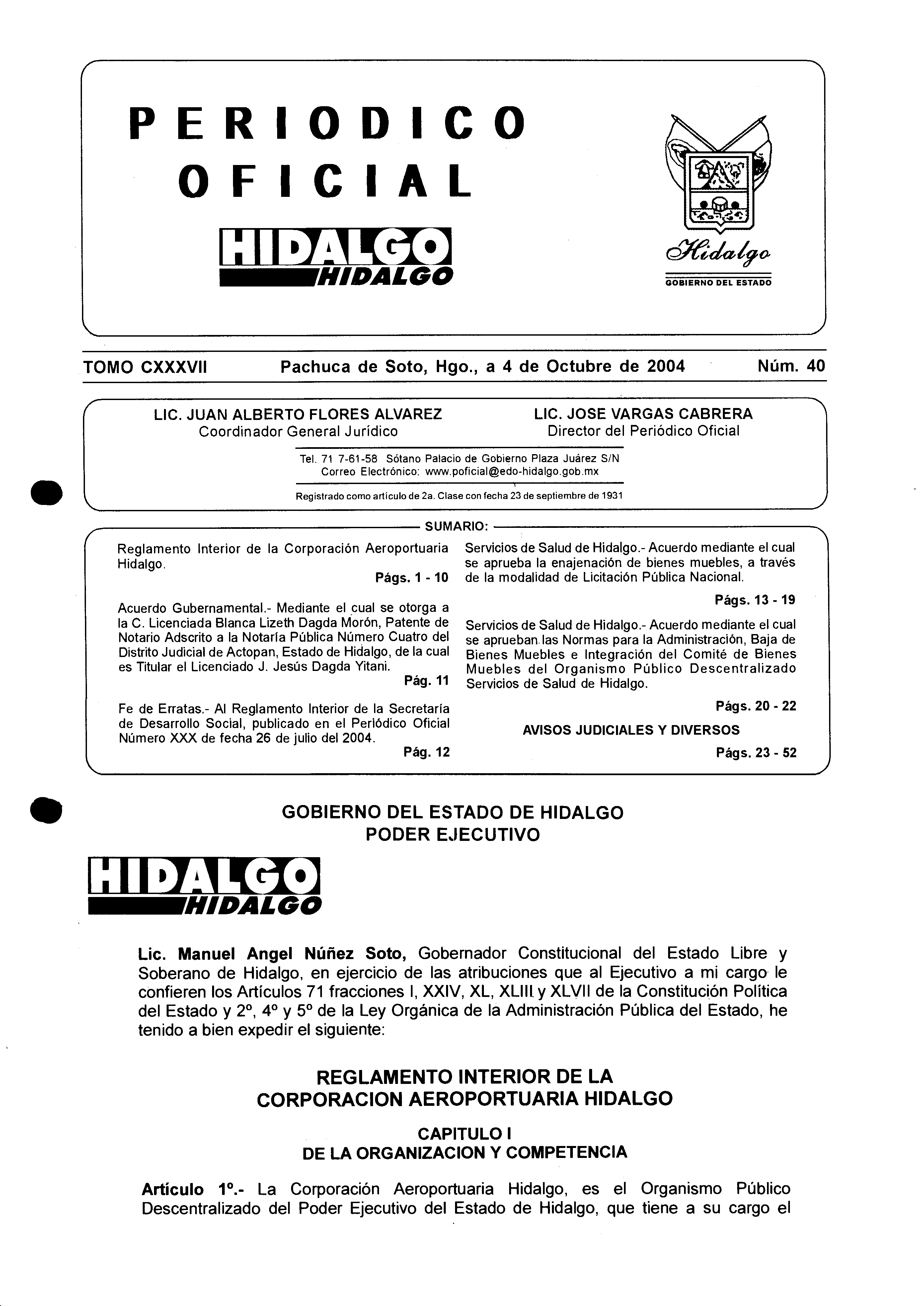 Descargar Periódico Oficial Ordinario 0 del 04 de octubre de 2004