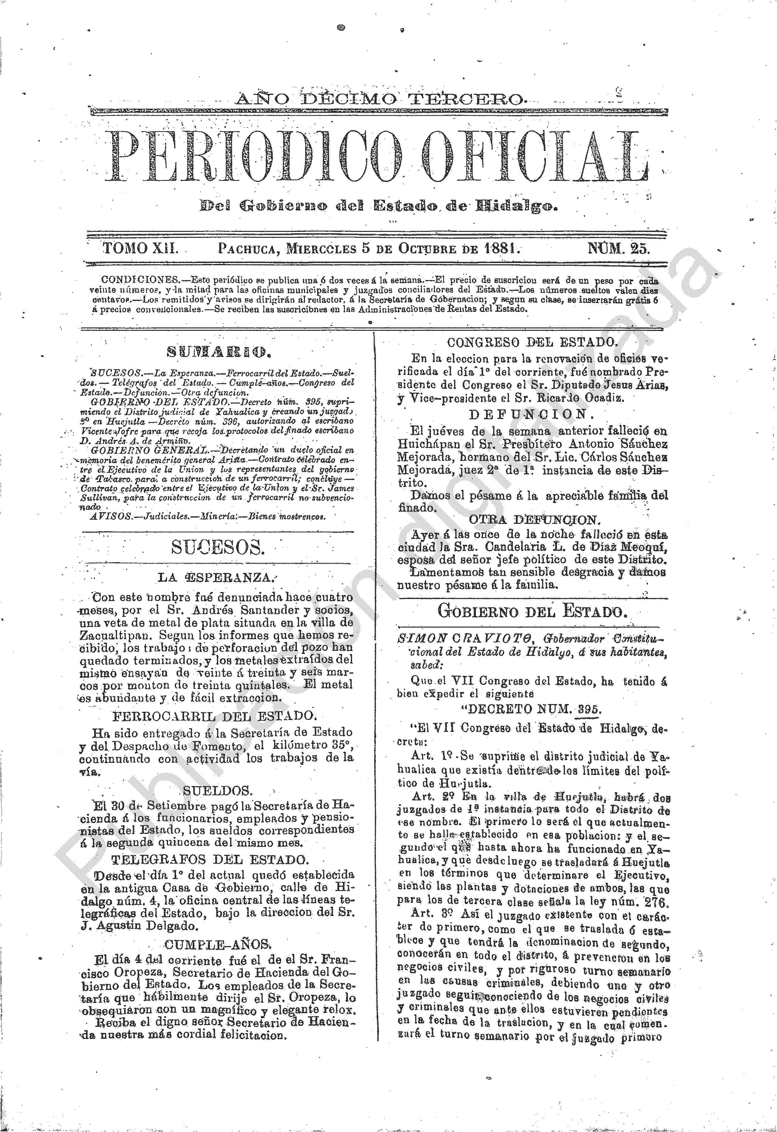 Descargar Periódico Oficial Ordinario 0 del 05 de octubre de 1881El portal web del Periódico Oficial del Estado de hidalgo es el único medio de difusión oficial del Gobierno del Estado de Hidalgo