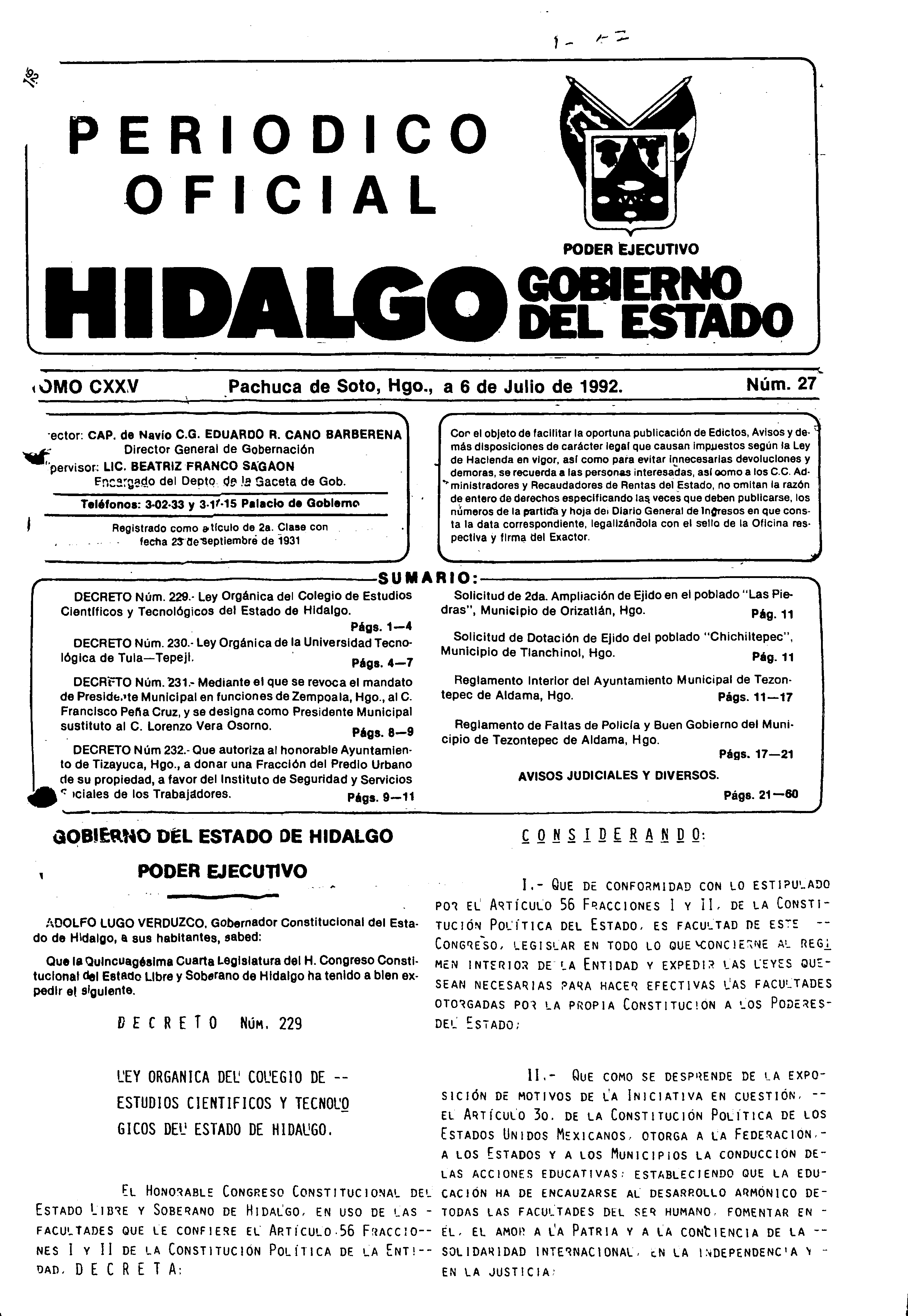 - Decreto Núm. 231.- Mediante el que se revoca el mandato de Presidente Municipal en funciones de Zempoala, Hgo., al C. Francisco Peña Cruz, y se designa como Presidente Municipal sustituto al C. Lorenzo Vera Osorno.