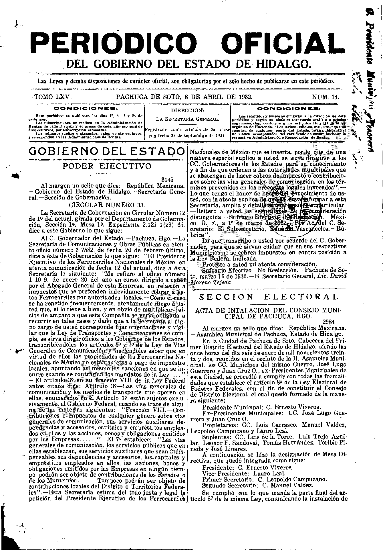 Descargar Periódico Oficial Ordinario 0 del 08 de abril de 1932