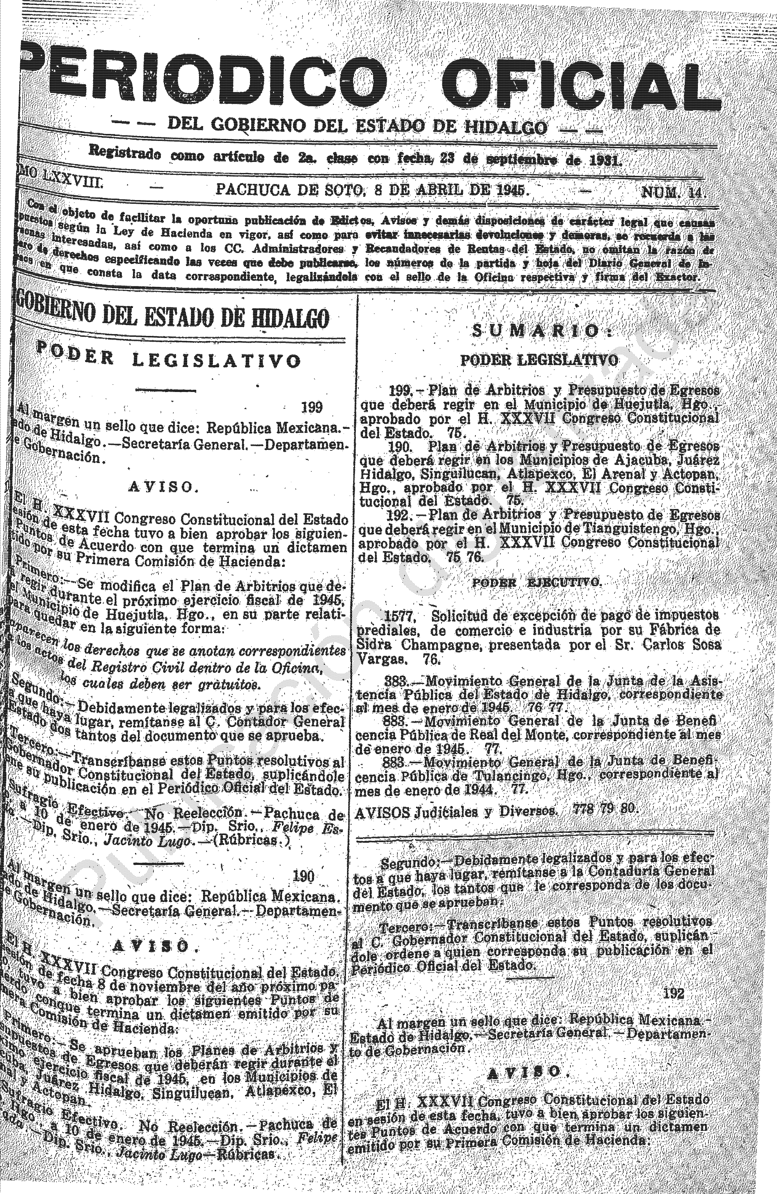 - 190.- Plan de Arbitrios y Presupuesto de Egresos que deberá regir en los Municipios de Ajacuba, Juárez Hidalgo, Singuilucan, Atlapexco, El Arenal y Actopan, Hgo, aprobado por el H. XXXVII Congreso Constitucional del Estado.