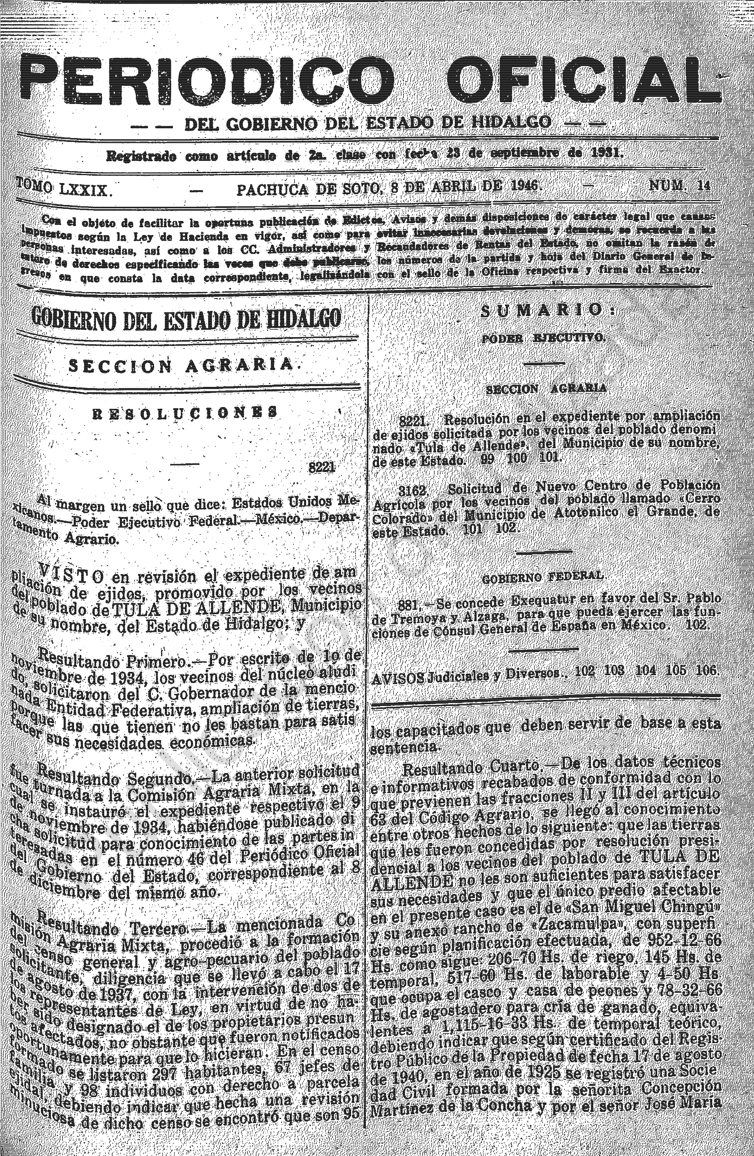 - 8221.- Resolución en el expediente por ampliación de ejidos solicitada por los vecinos del poblado denominado “Tula de Allende” del Municipio de su nombre, de este Estado.