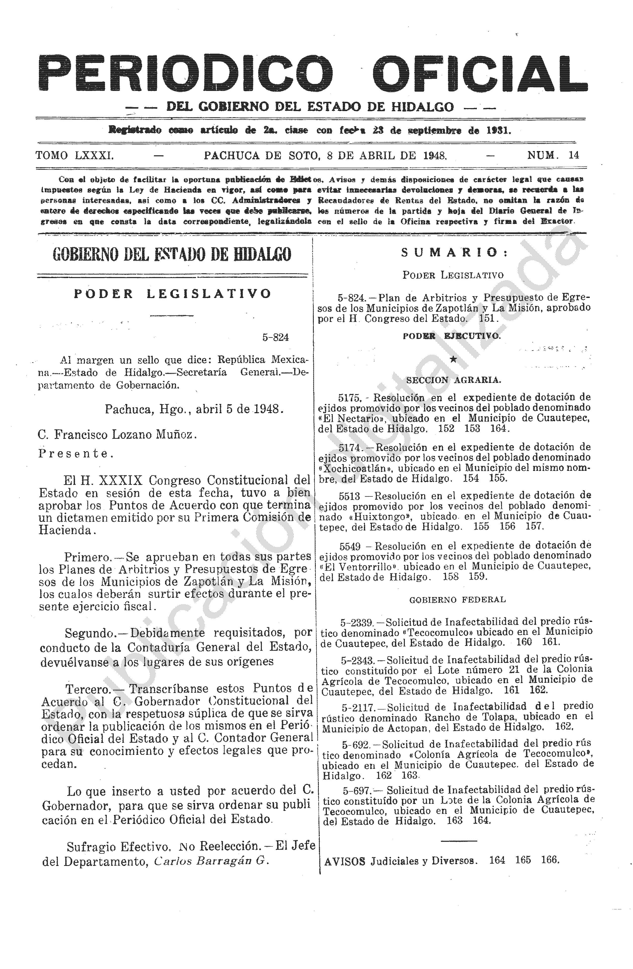 - 5513.- Resolución en el expediente de dotación de ejidos promovido por los vecinos del poblado denominado “Huixtongo”, ubicado en el Municipio de Cuautepec, del Estado de Hidalgo.
