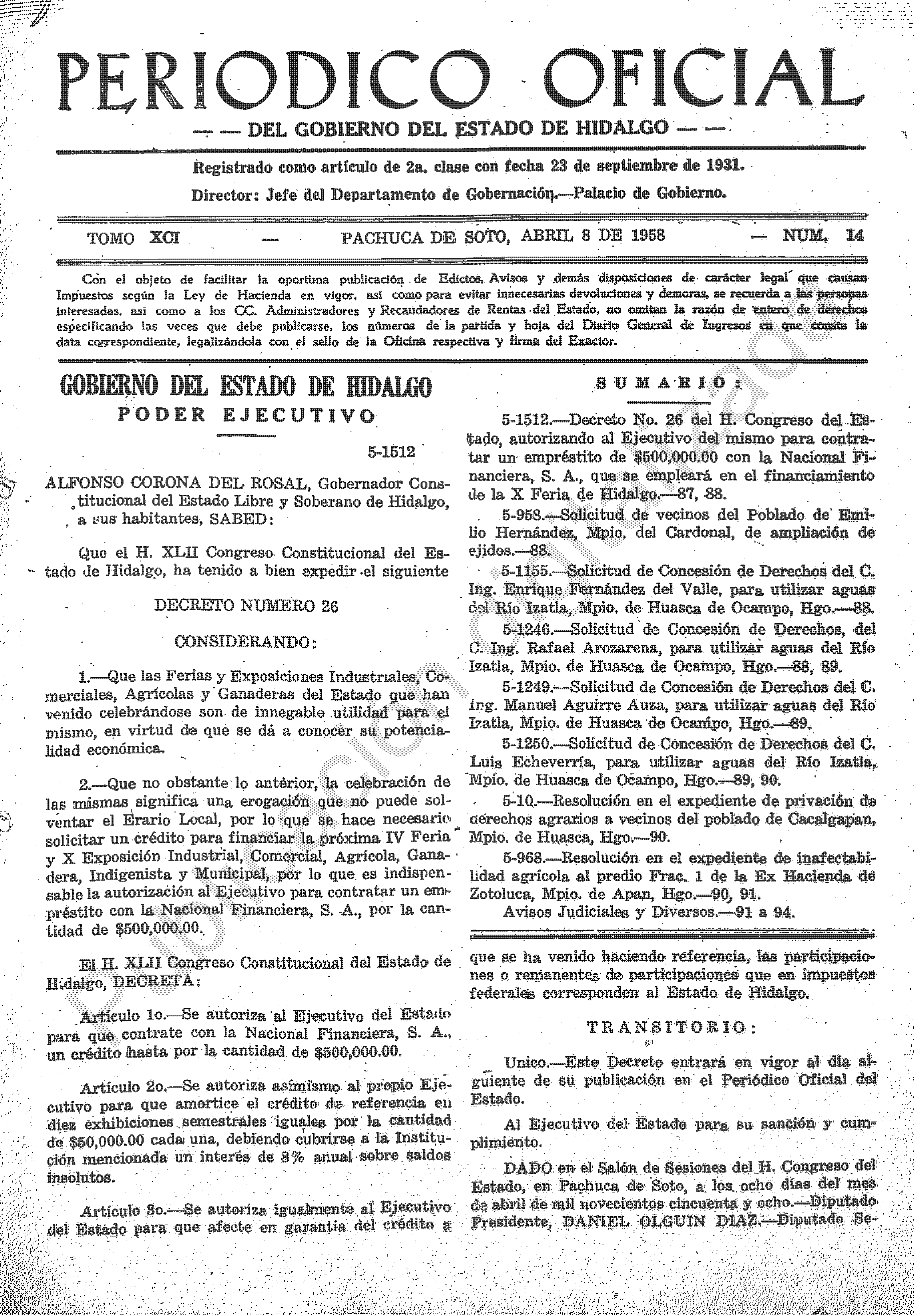 - 5-1512.- Decreto No. 26 del H. Congreso del Estado, autorizando al Ejecutivo del mismo para contratar un empréstito de $500,000.00 con la Nacional Financiera, S.A., que se empleará en el financiamiento de la X Feria de Hidalgo.