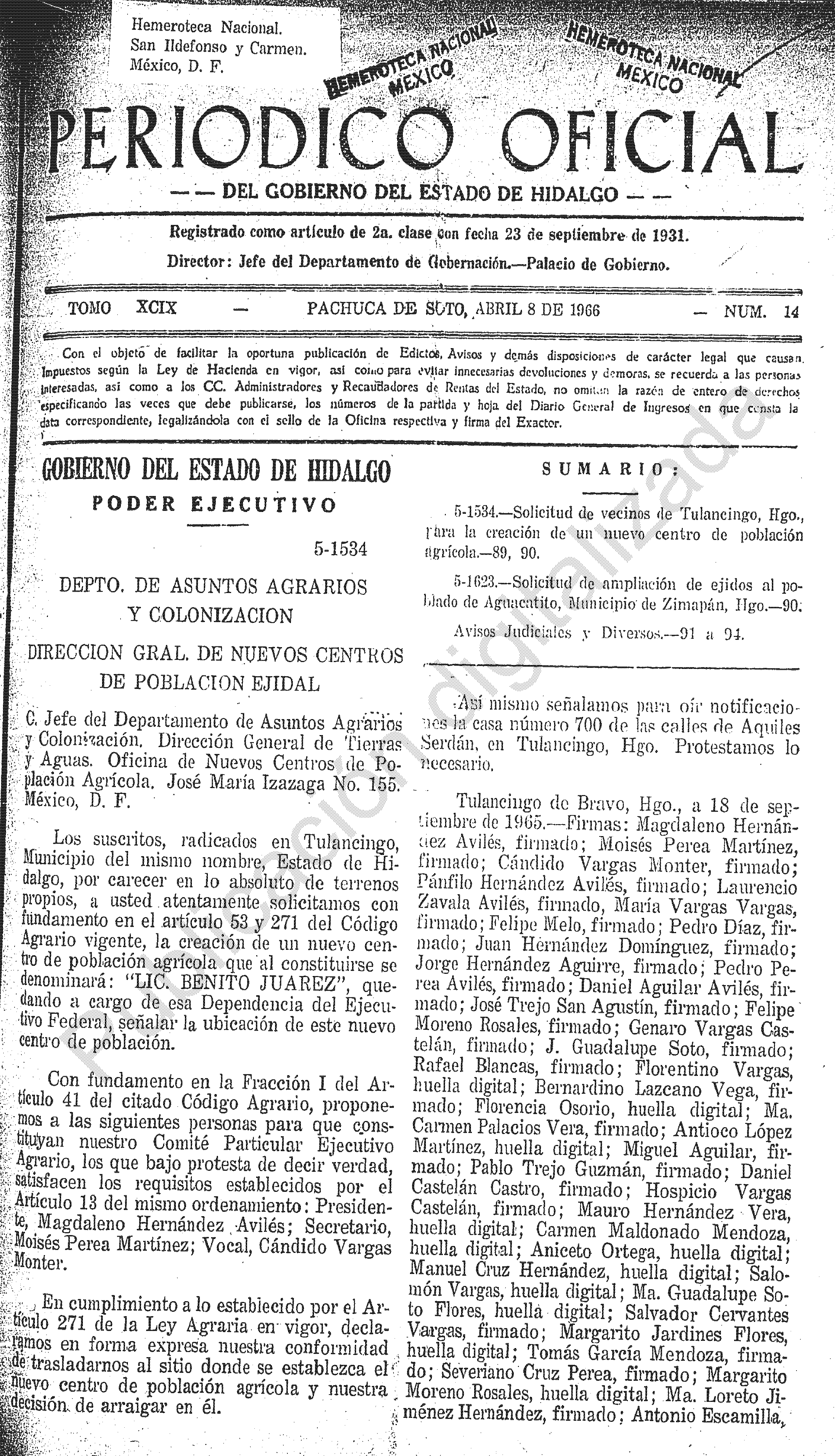 - 5-1534.- Solicitud de vecinos de Tulancingo, Hgo., para la creación de un nuevo de población agrícola.