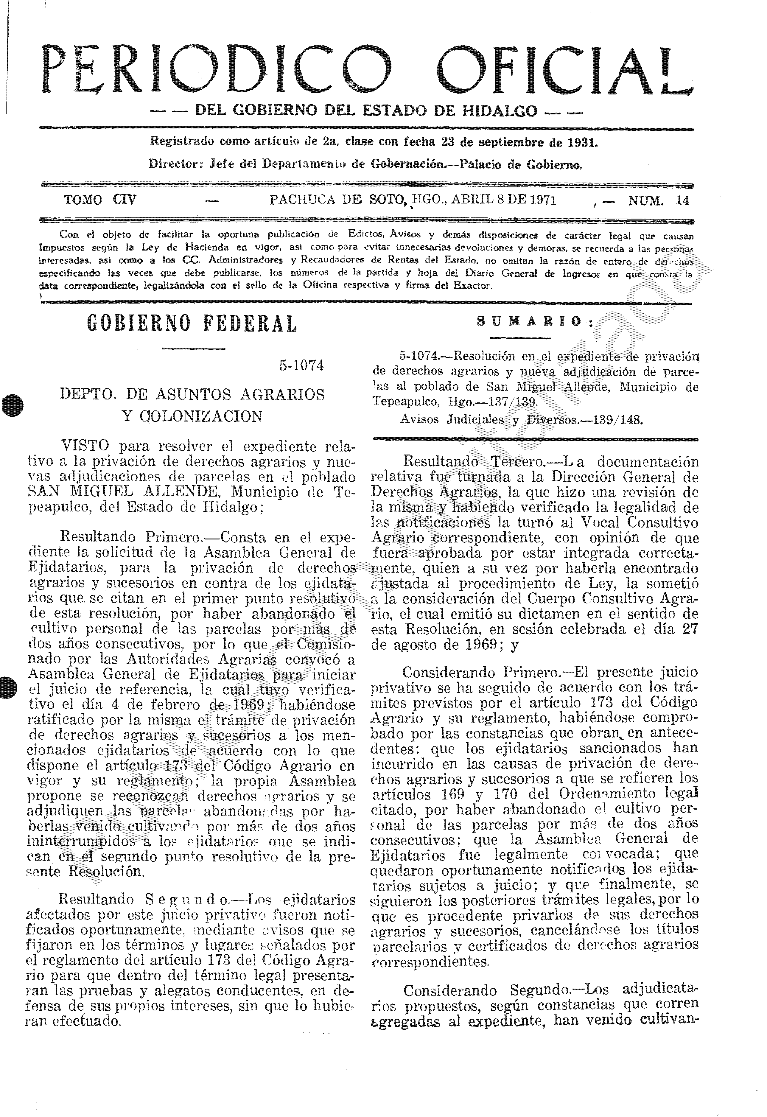 • 5-1074.- Resolución en el expediente de privación de derechos agrarios y nuevas adjudicación de parcelas al poblado de San Miguel Allende, Municipio de Tepeapulco, Hgo.