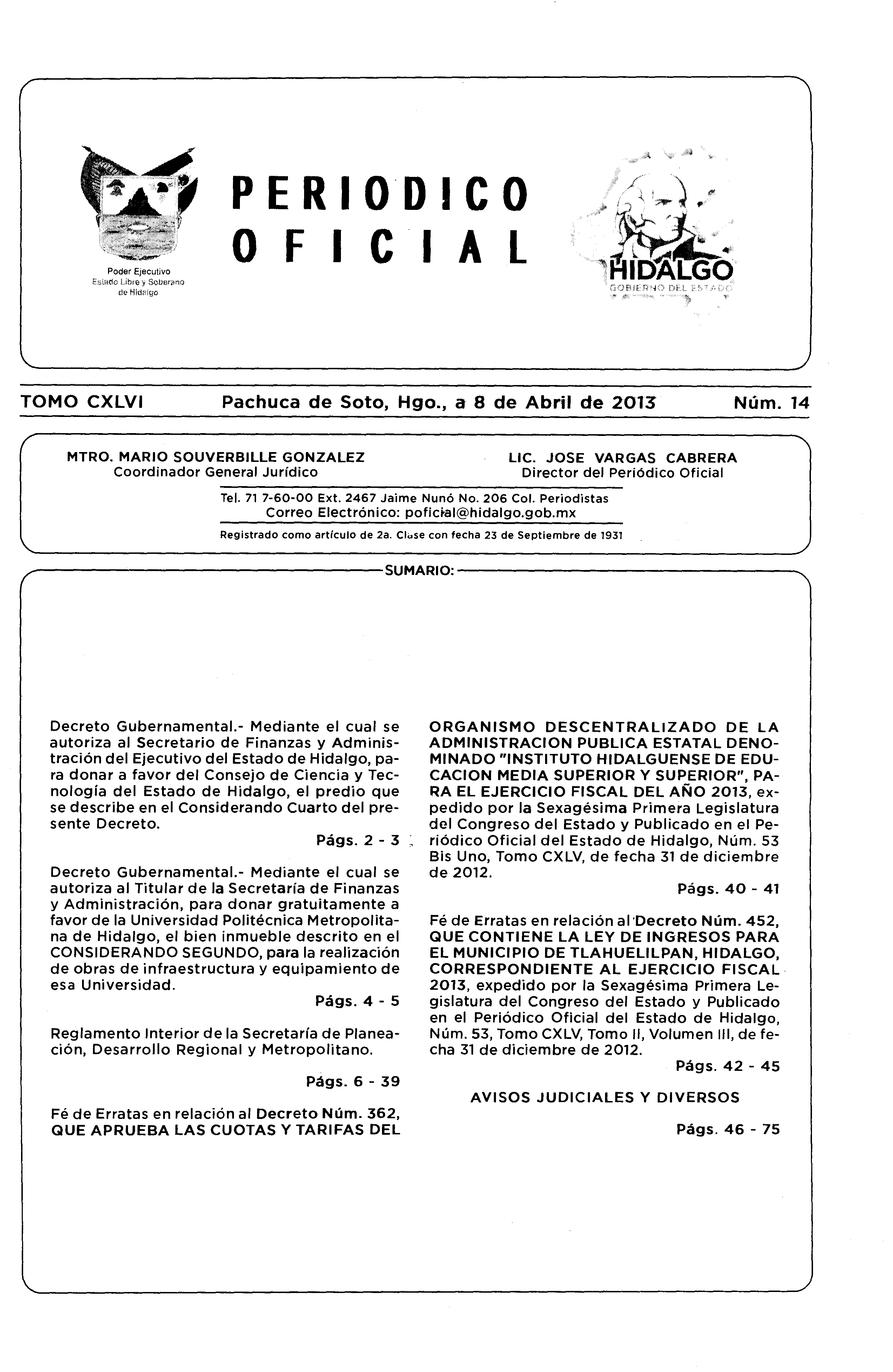 El portal web del Periódico Oficial del Estado de hidalgo es el único medio de difusión oficial del Gobierno del Estado de Hidalgo