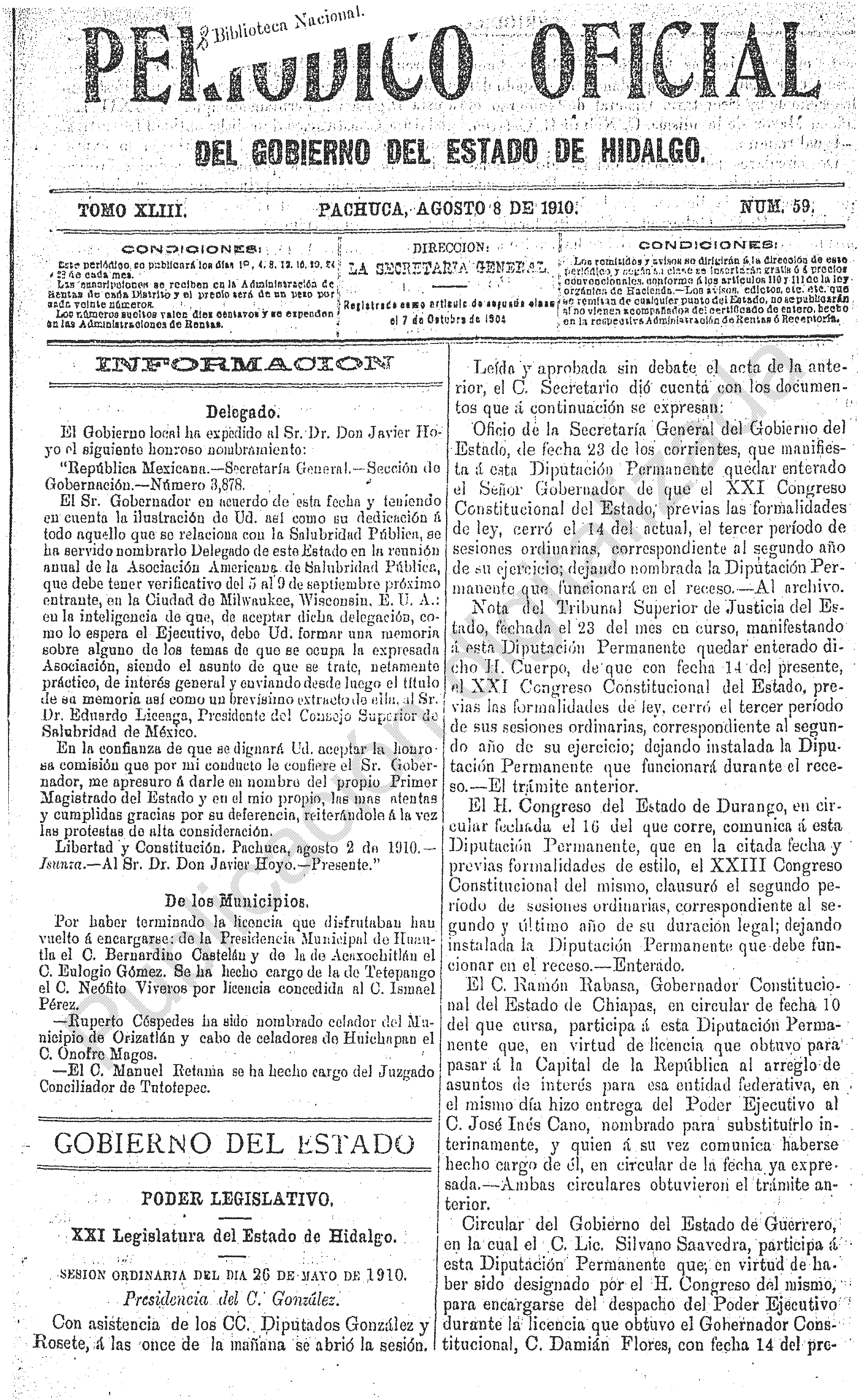 Descargar Periódico Oficial Ordinario 0 del 08 de agosto de 1910Tamaño 902.12 KB