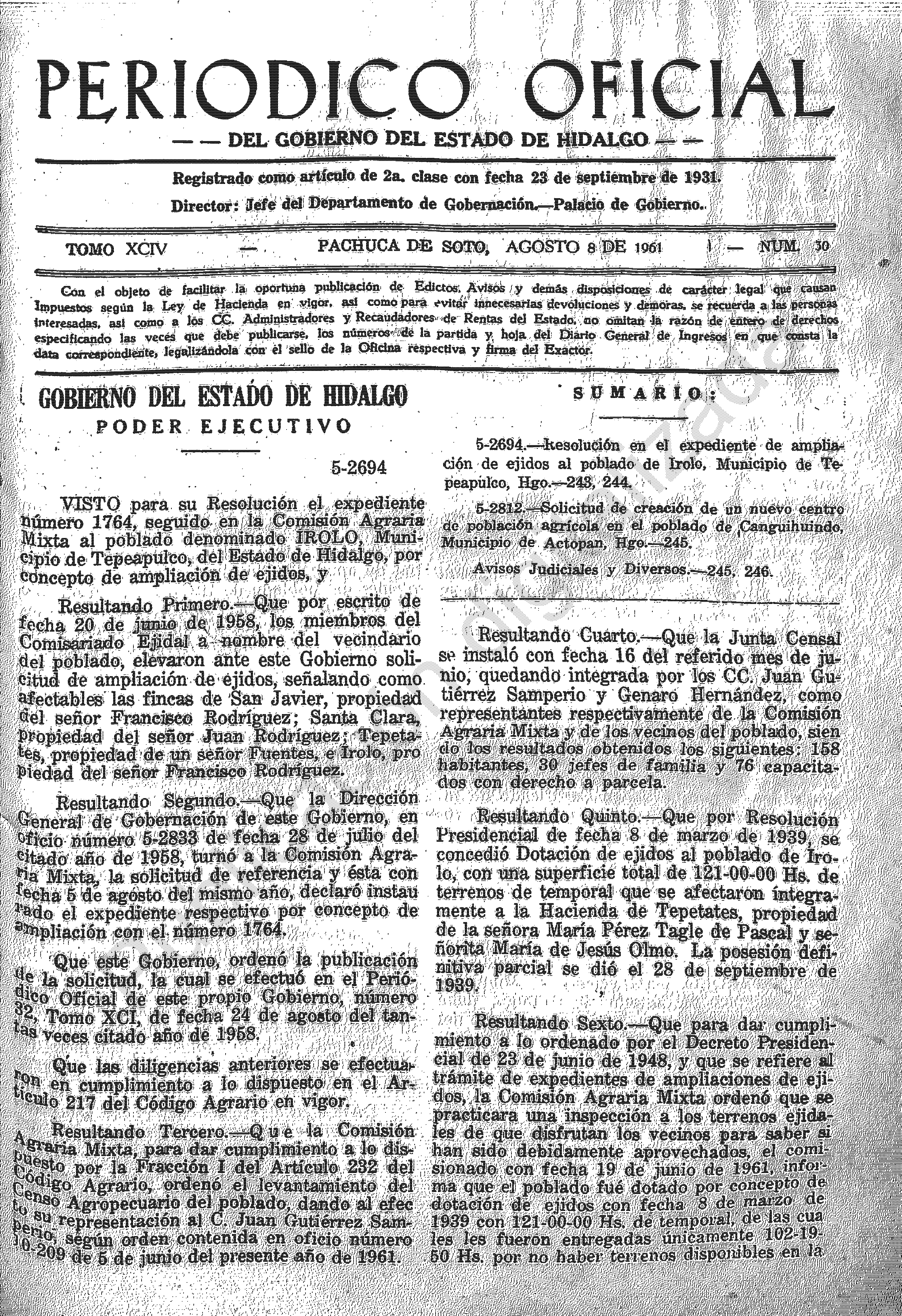 Descargar Periódico Oficial Ordinario 0 del 08 de agosto de 1961