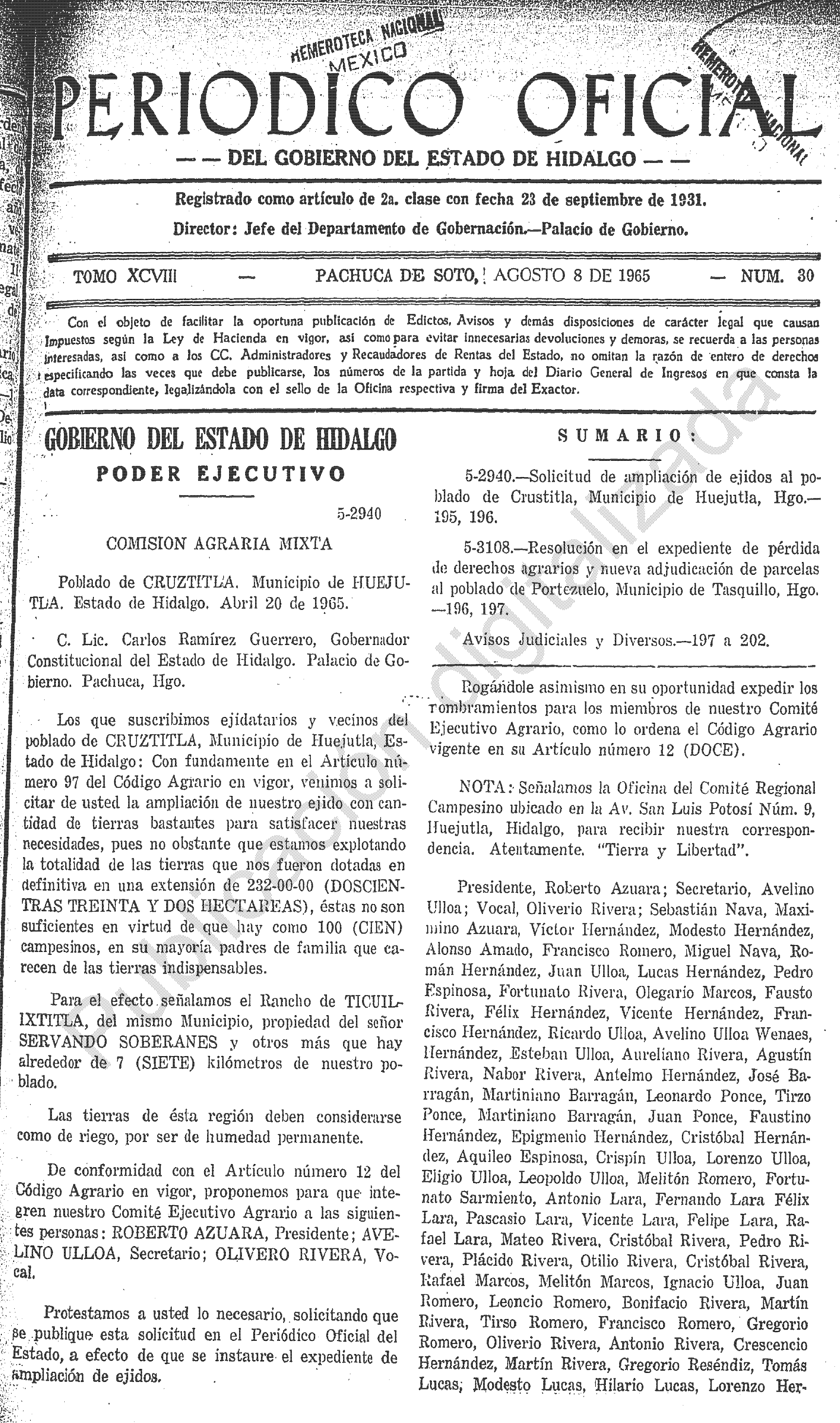 - 5-2940.- Solicitud de ampliación de ejidos al poblado de Crustitla, Municipio de Huejutla, Hgo.
