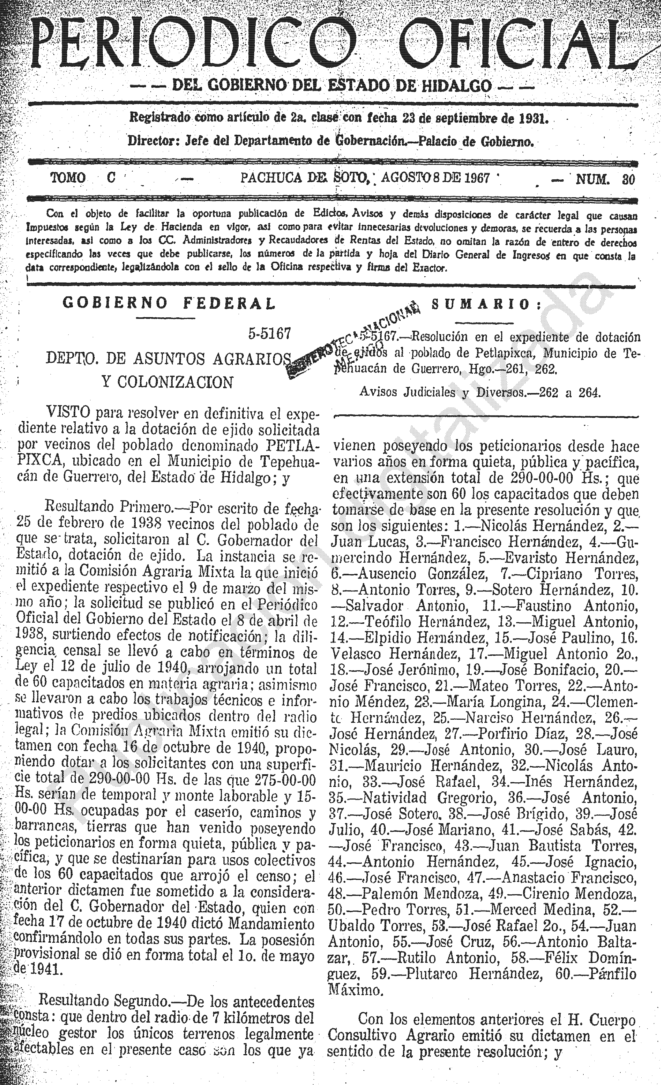 - 5-5167.- Resolución en el expediente de dotación de ejidos al poblado de Petlapixca, Municipio de Tepehuacán de Guerrero, Hgo.