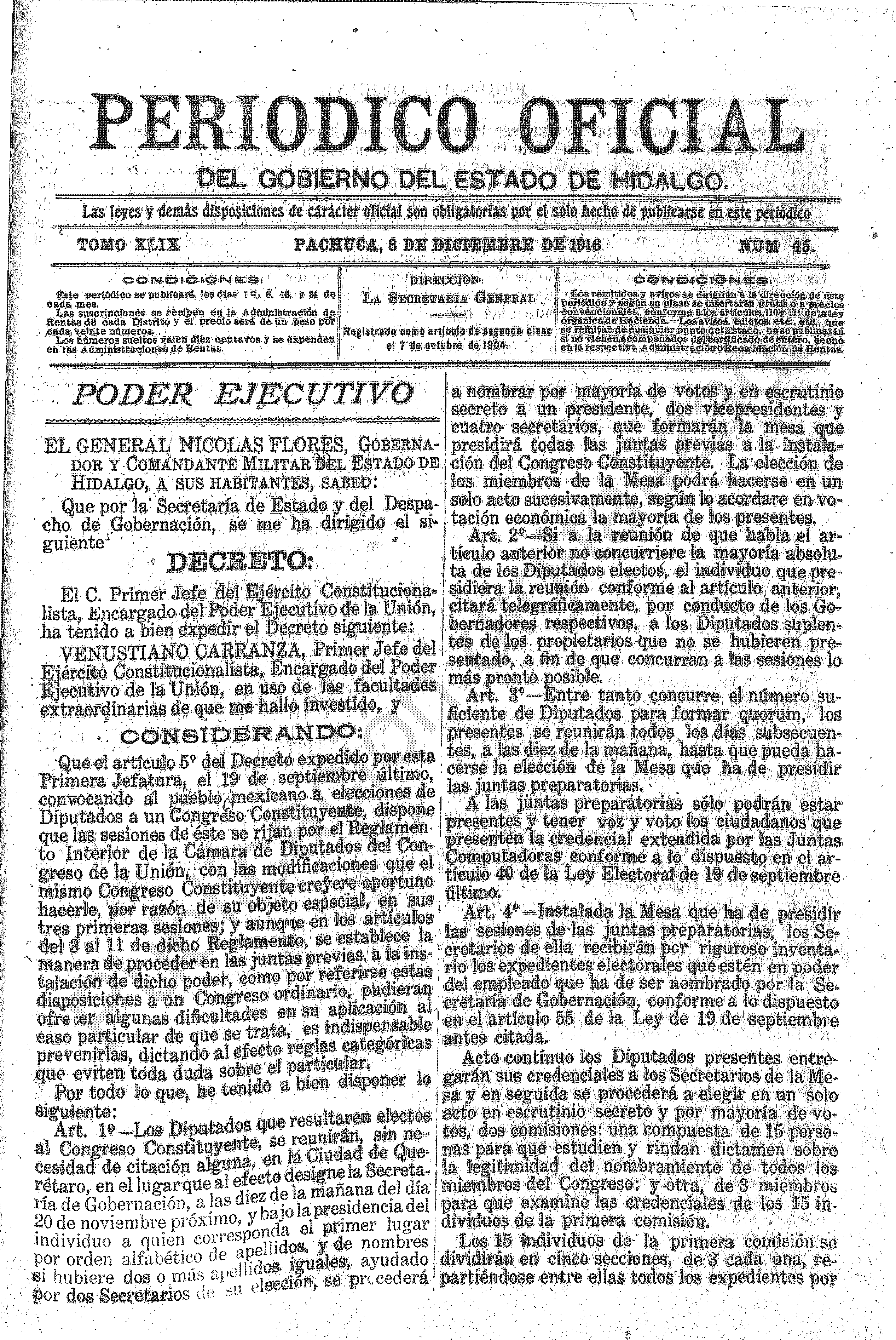 • Poder Ejecutivo, Nicolas Flores, Gobernador Constitucional del Estado Libre y Soberano de Hidalgo, Decreto, Nicolas Flores, Decreto por el cual convocan al Pueblo Mexicano a elecciones de Diputados a un Congreso Constituyente, Gobernador Constitucional del Estado Libre y Soberano de Hidalgo.