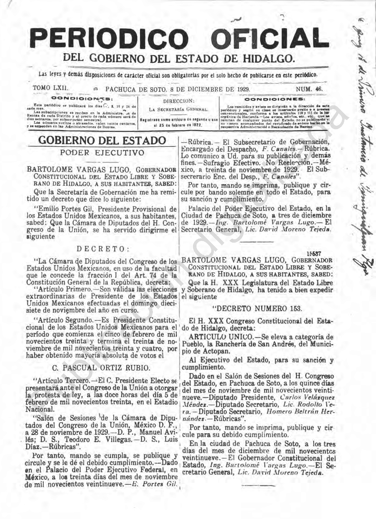 - 15537.-DECRETO NUMERO 153. Se eleva a categoría de Pueblo, la Rancheria de San Andrés, Municipio de Actopan.