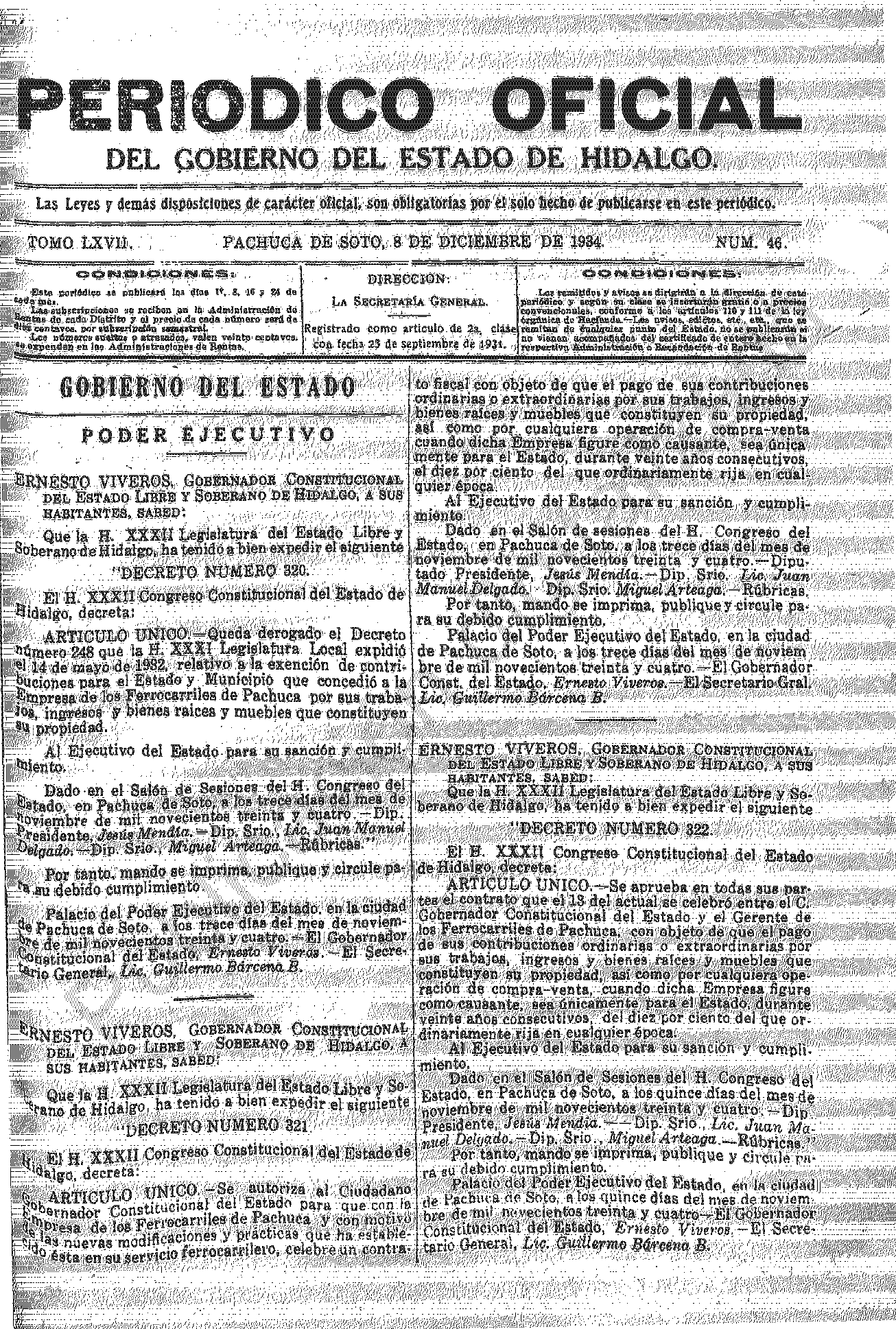 - Decreto Número 321, Se autoriza al Ciudadano Gobernador Constitucional del Estado para que la Empresa de los Ferrocarriles de Pachuca y con motivo de las nuevas modificaciones y prácticas que ha establecido ésta en su servicio ferrocarrilero, celebre un contrato fiscal con objeto de que el pago de sus contribuciones ordinarias o extraordinarias por sus trabajos, ingresos y bienes raíces y muebles que constituyen su propiedad.