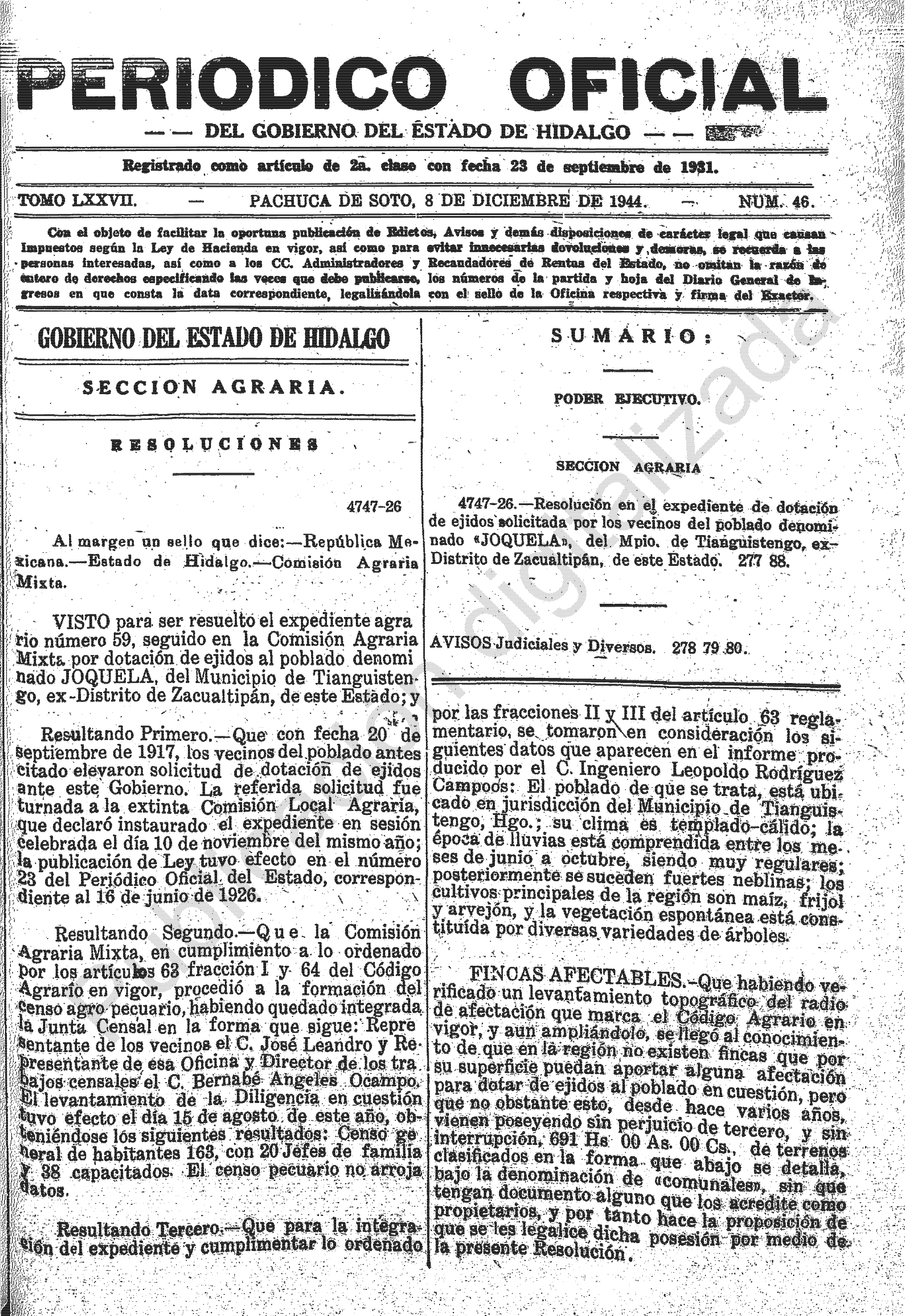 Descargar Periódico Oficial Ordinario 0 del 08 de diciembre de 1944