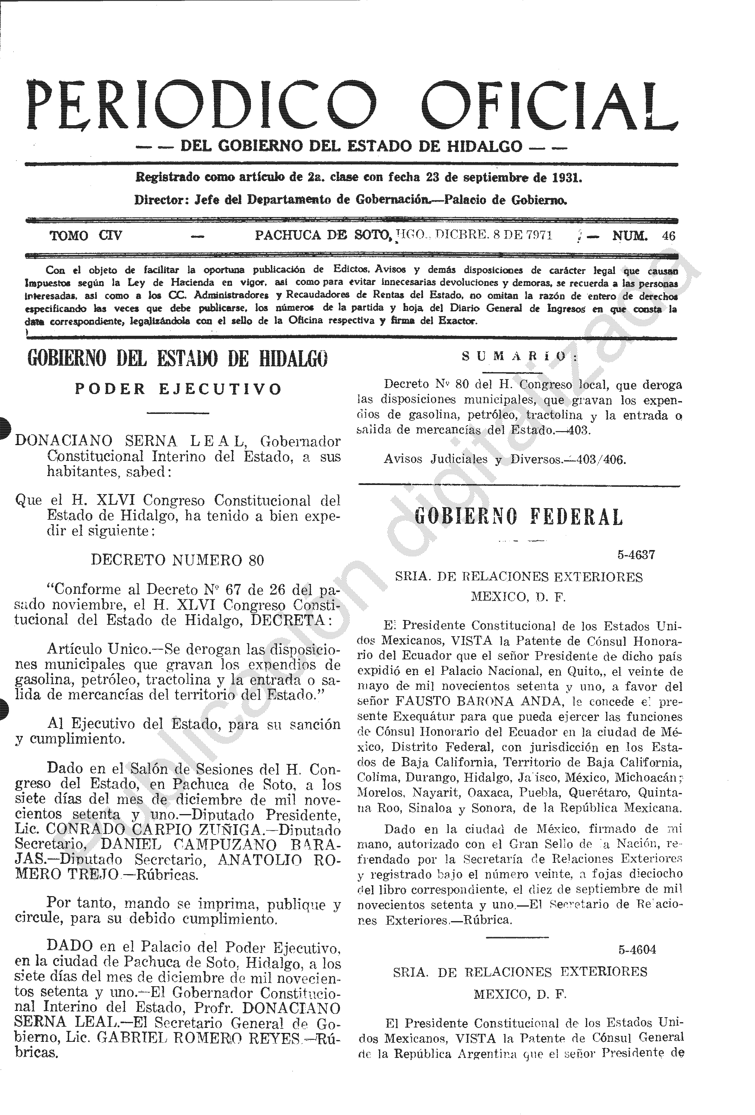 Descargar Periódico Oficial Ordinario 0 del 08 de diciembre de 1971