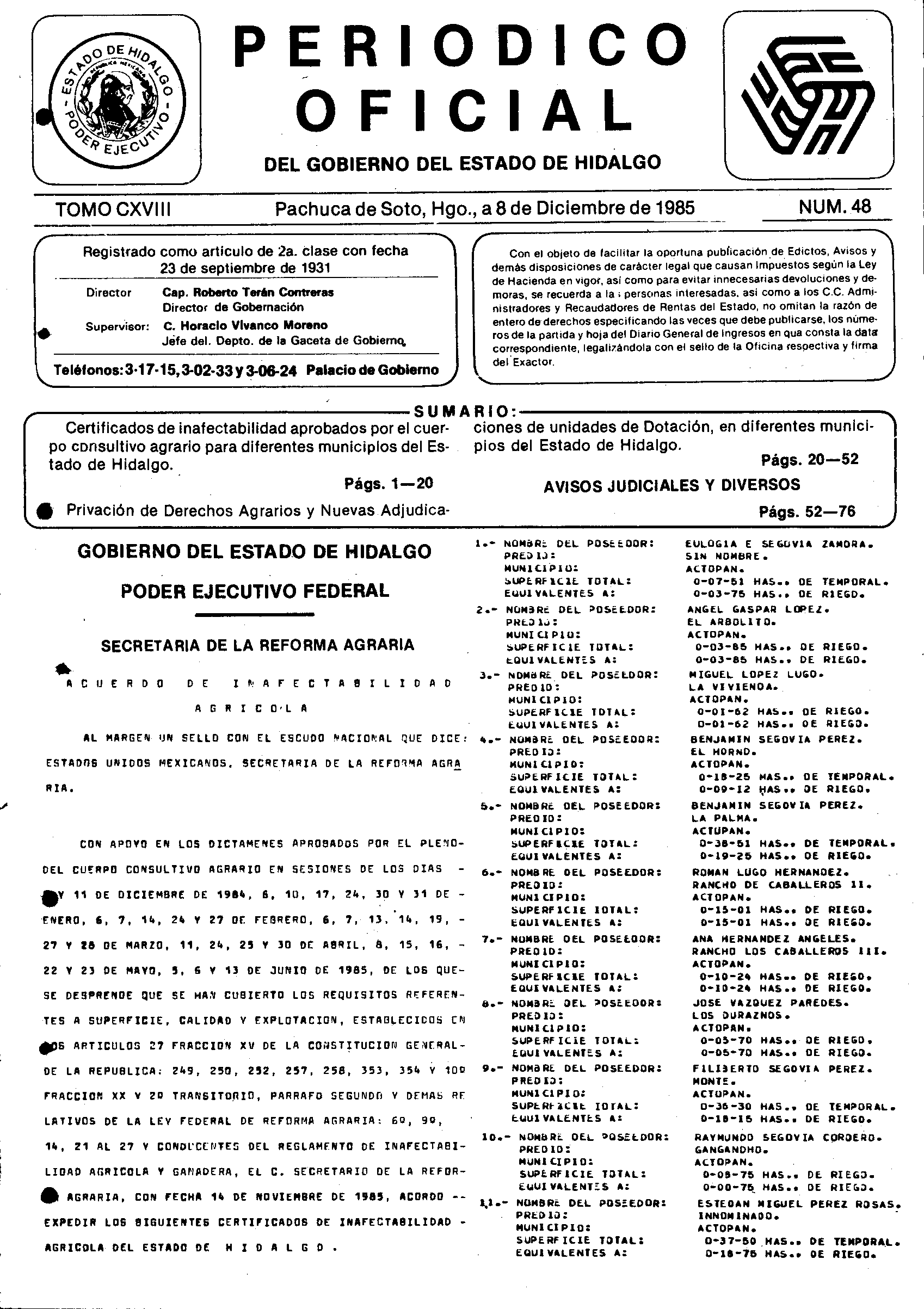 Periódico Oficial Ordinario 0 del 08 de diciembre de 1985