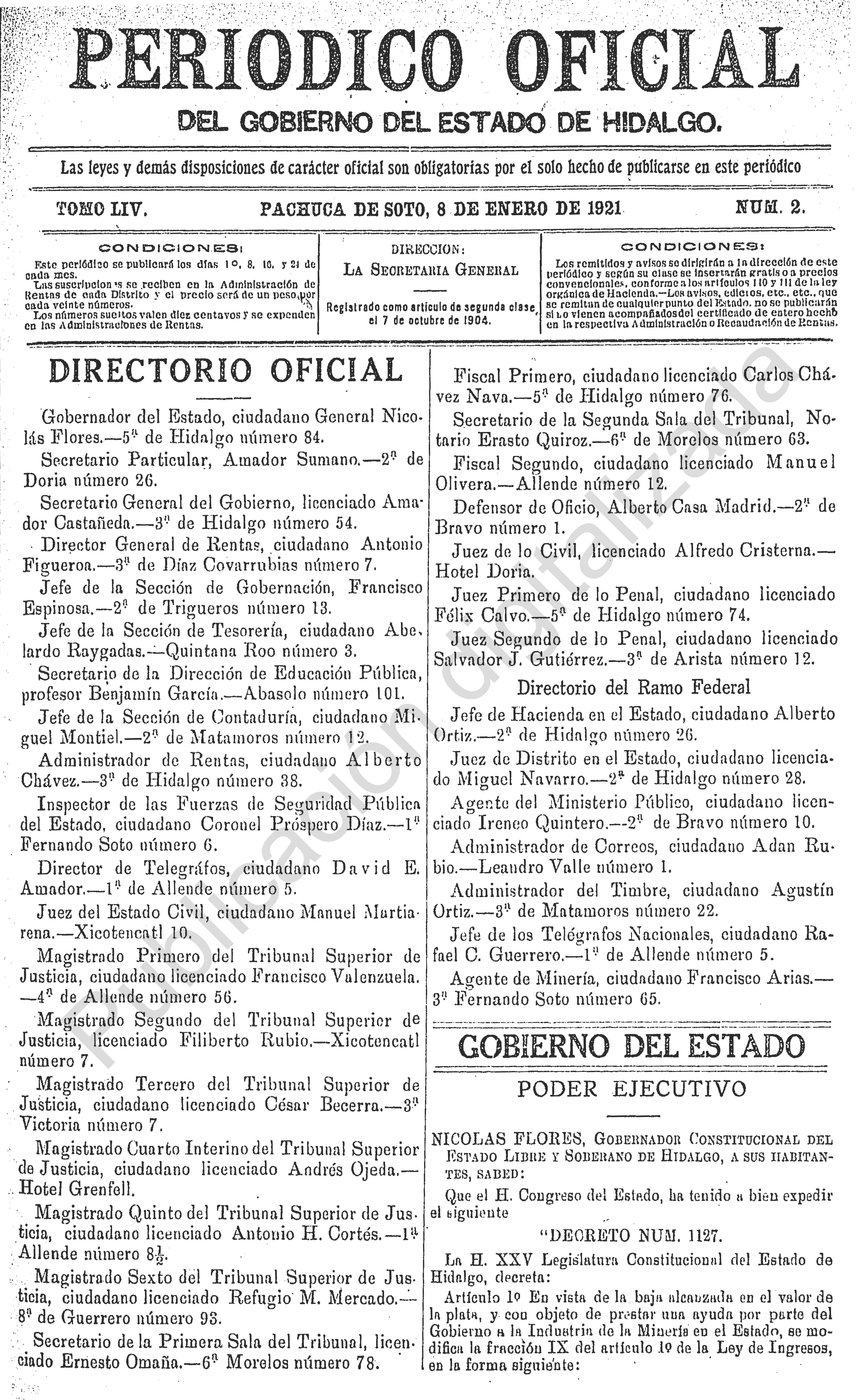 Descargar Periódico Oficial Ordinario 0 del 08 de enero de 1921El portal web del Periódico Oficial del Estado de hidalgo es el único medio de difusión oficial del Gobierno del Estado de Hidalgo