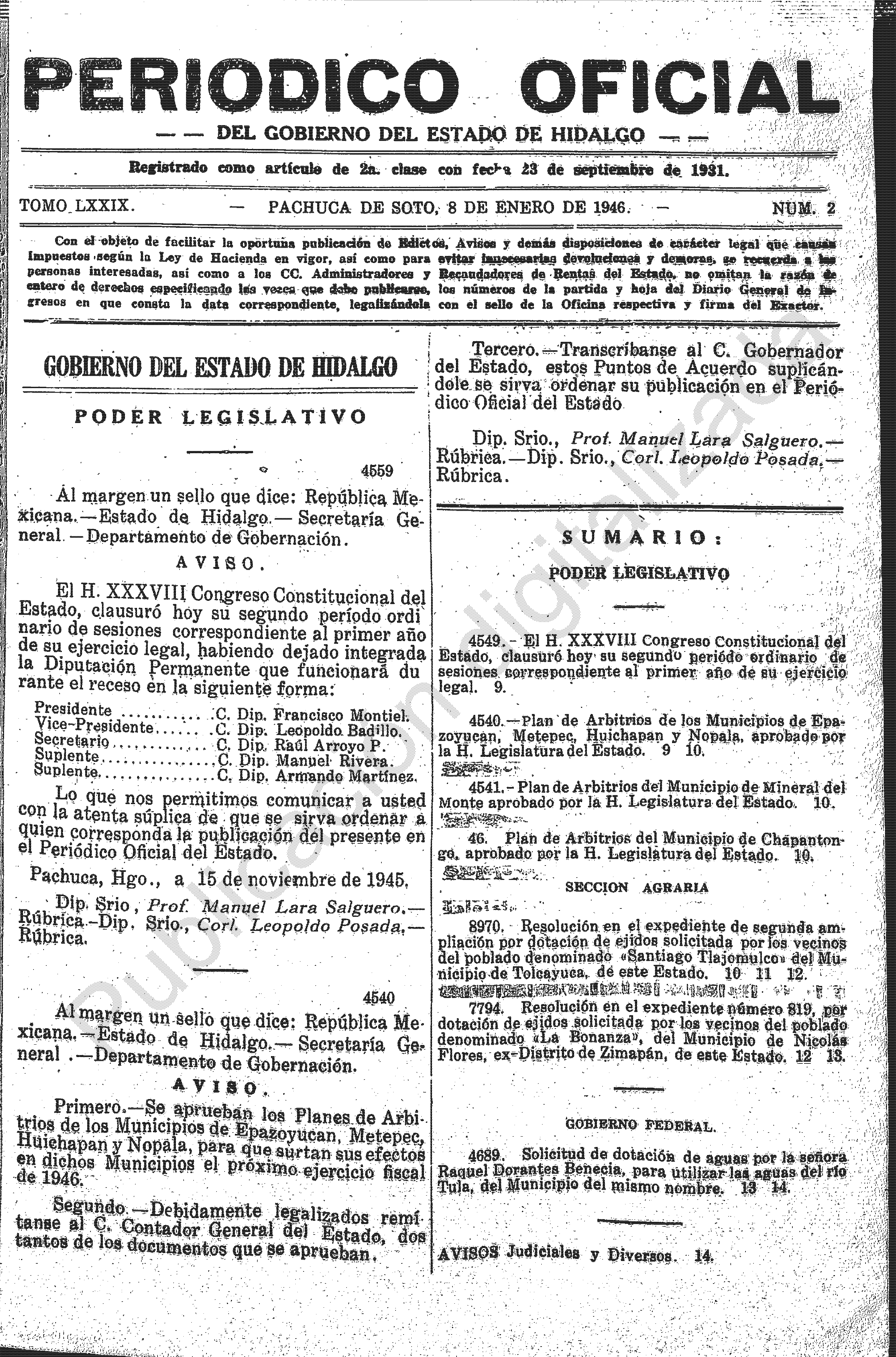 Descargar Periódico Oficial Ordinario 0 del 08 de enero de 1946
