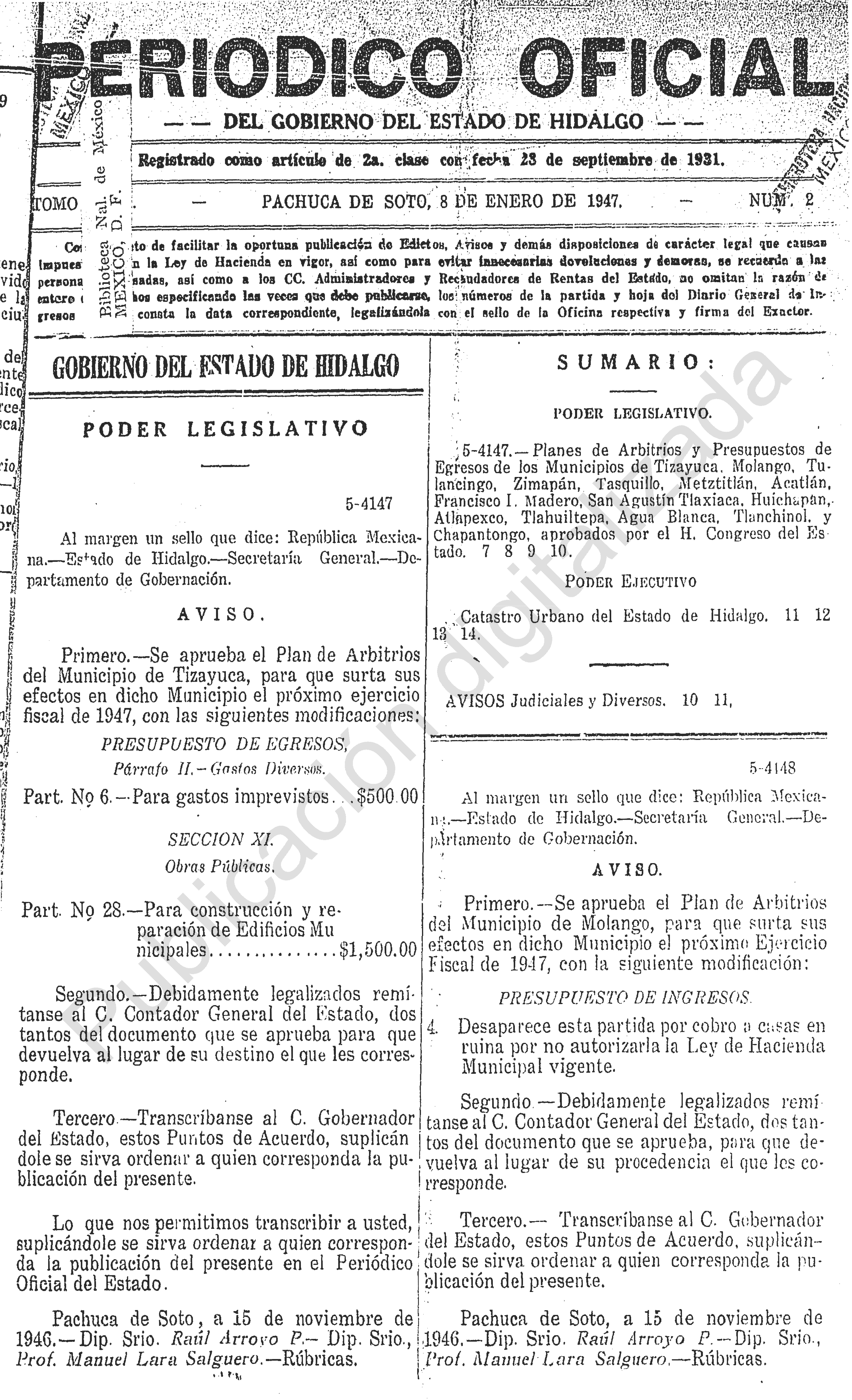 Descargar Periódico Oficial Ordinario 0 del 08 de enero de 1947