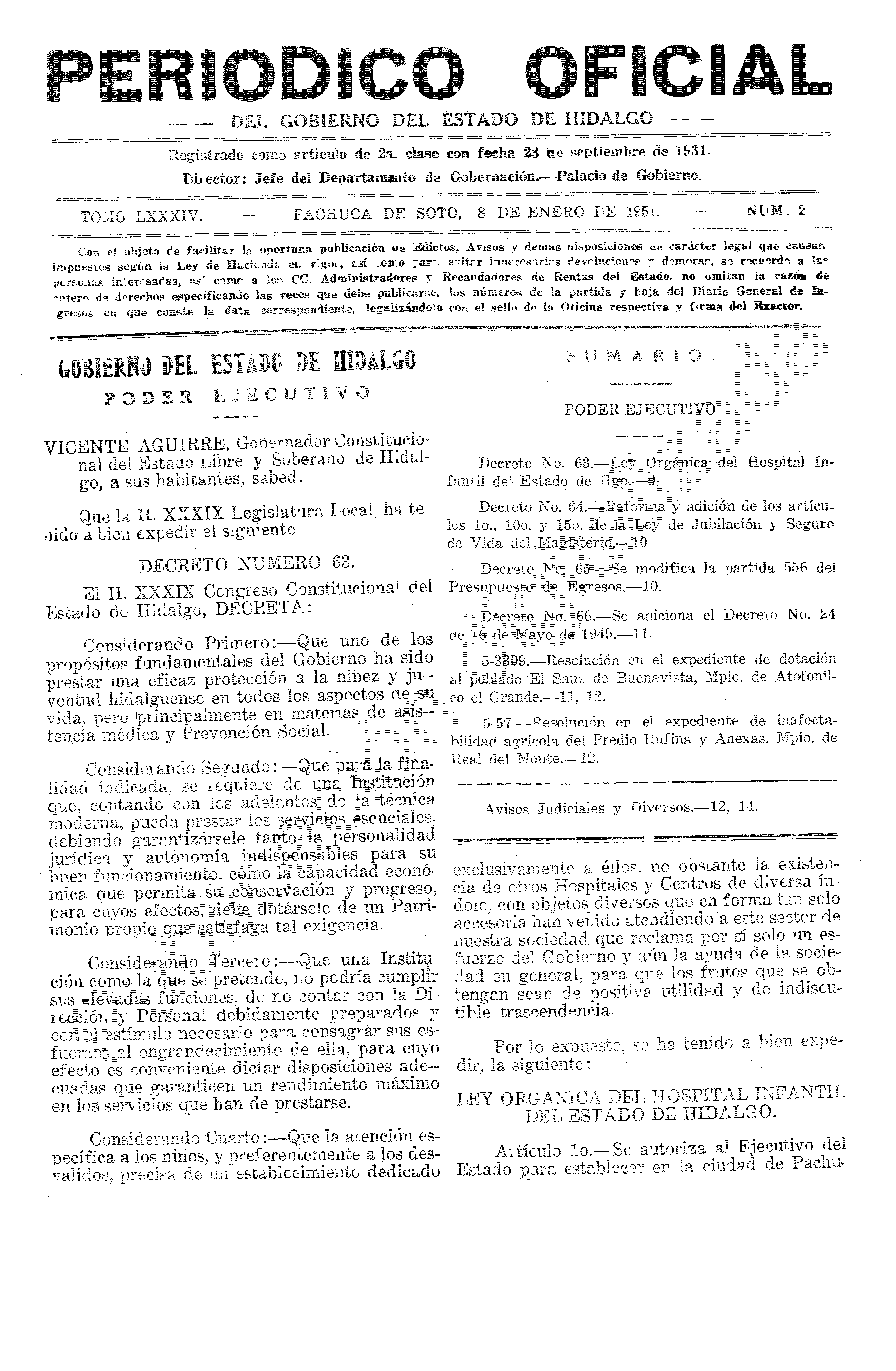 - Decreto No. 63.- Ley Orgánica del Hospital Infantil del Estado de Hgo.