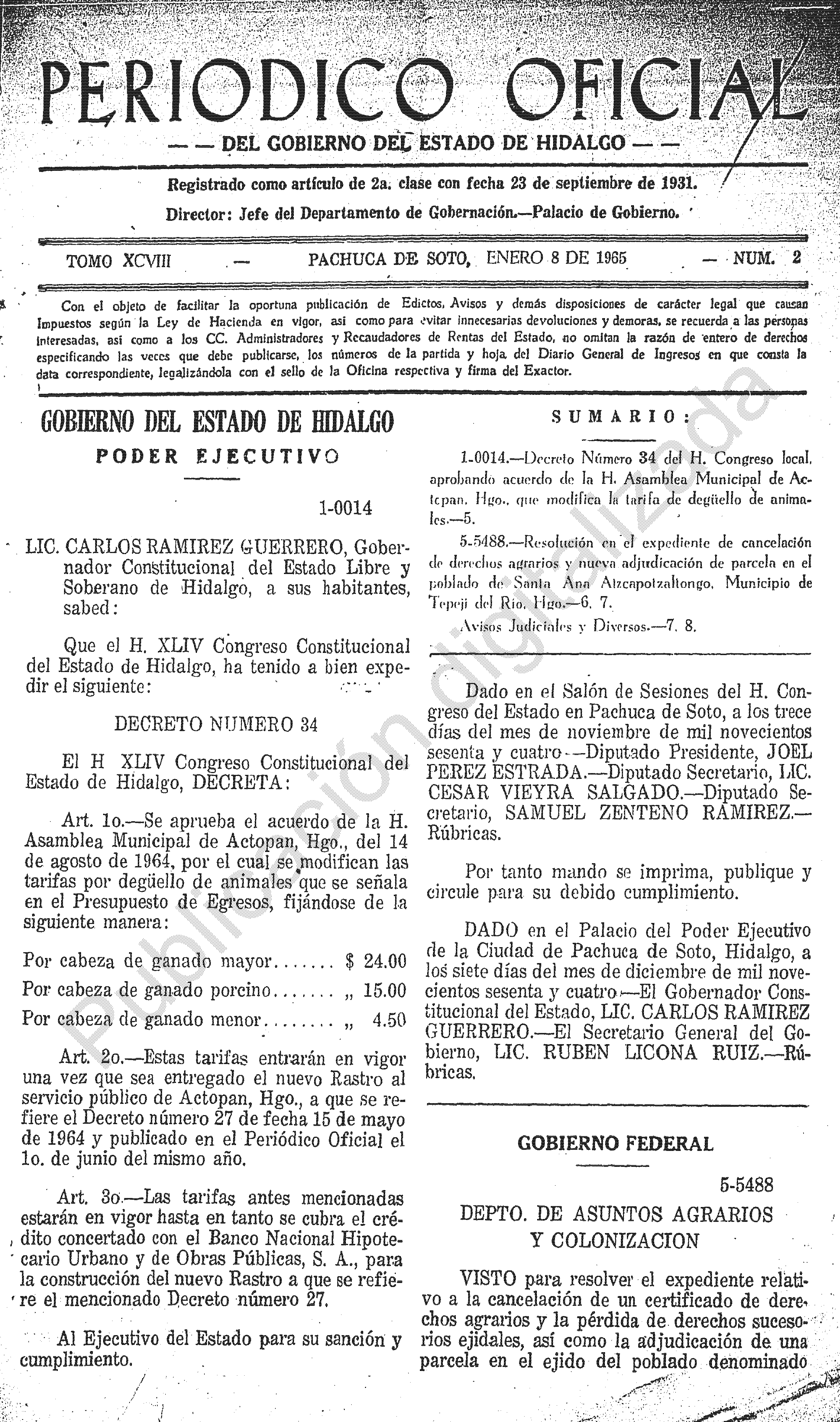 • 1-0014.- Decreto Número 34 del H. Congreso local, aprobando acuerdo de la H. Asamblea Municipal de Actopan, Hgo., que modifica la tarifa de degüello de animales.