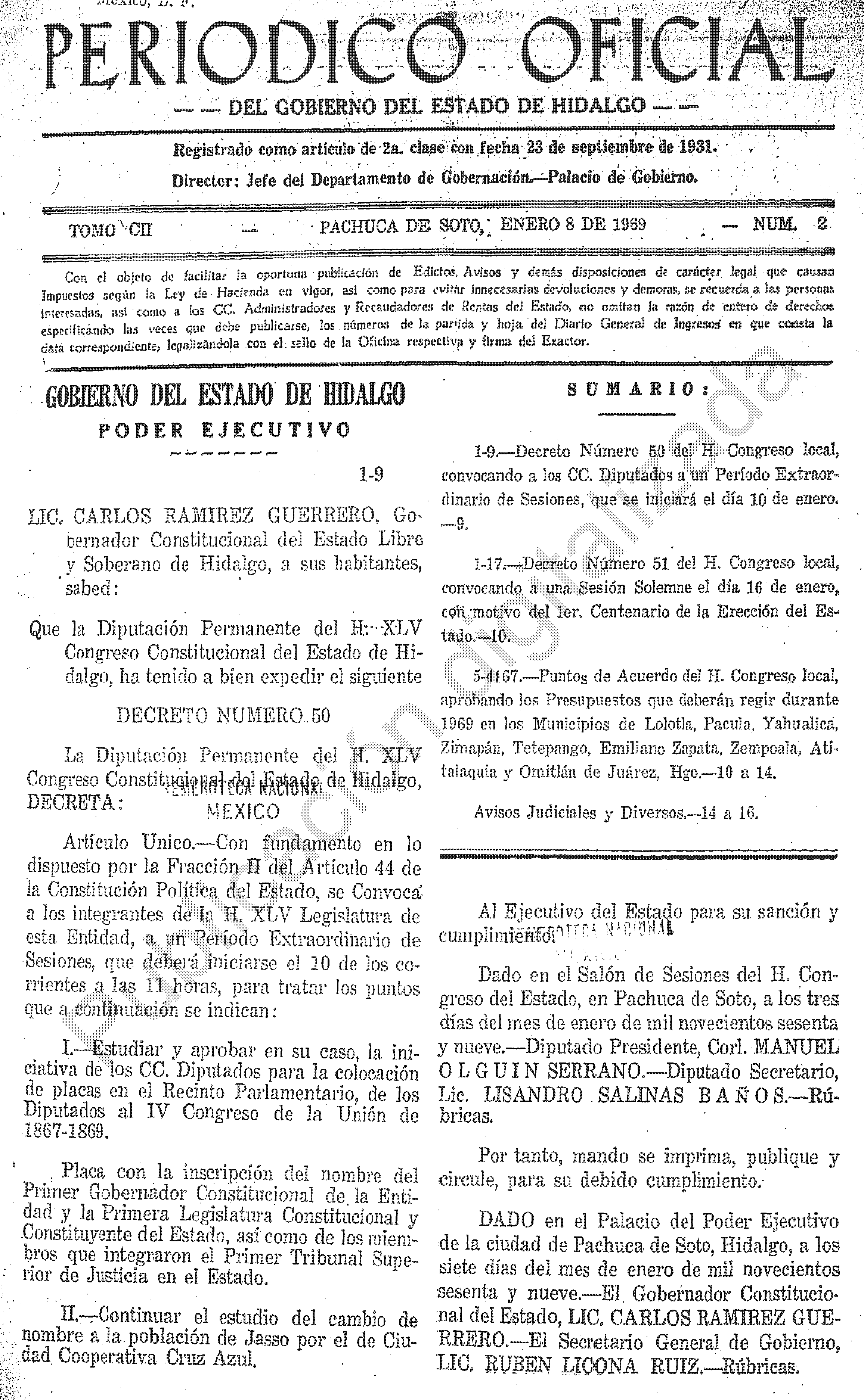 Descargar Periódico Oficial Ordinario 0 del 08 de enero de 1969