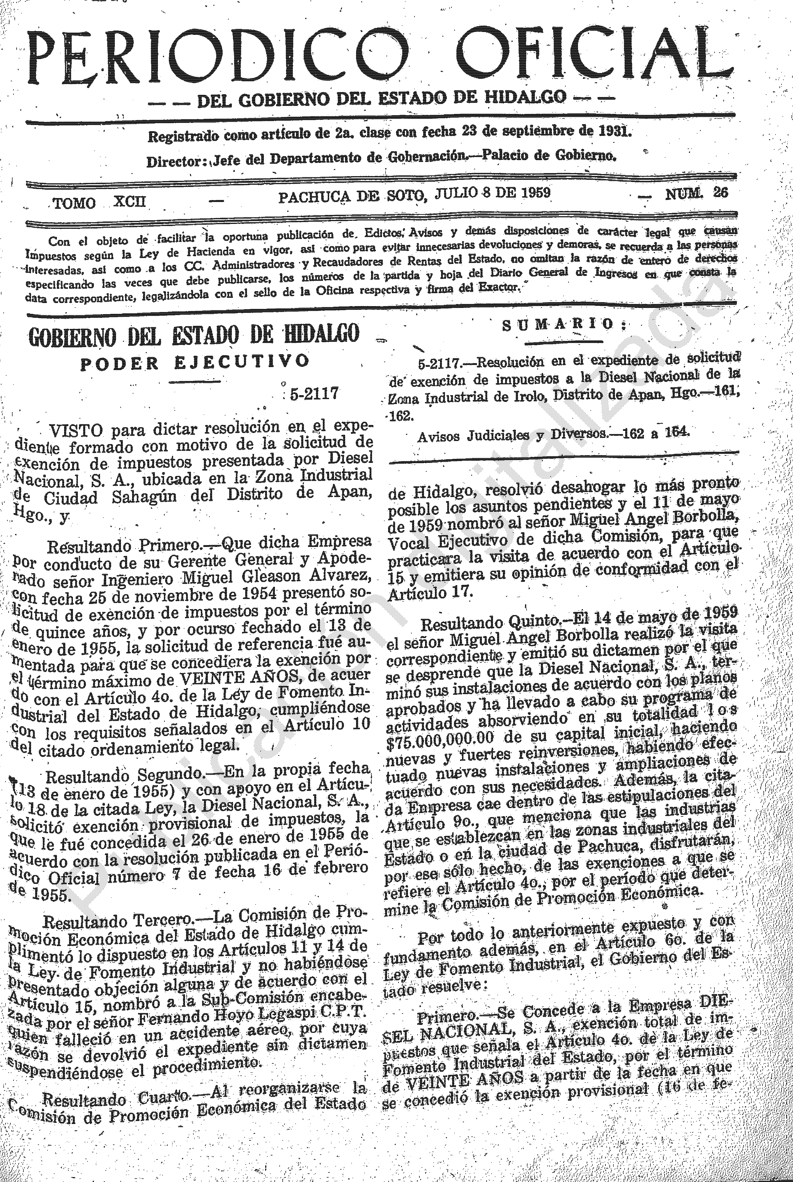 - 5-2117.- Resolución en el expediente de solicitud de exención de impuestos a la Diesel Nacional de la Zona Industrial de Irolo, Distrito de Apan, Hgo.