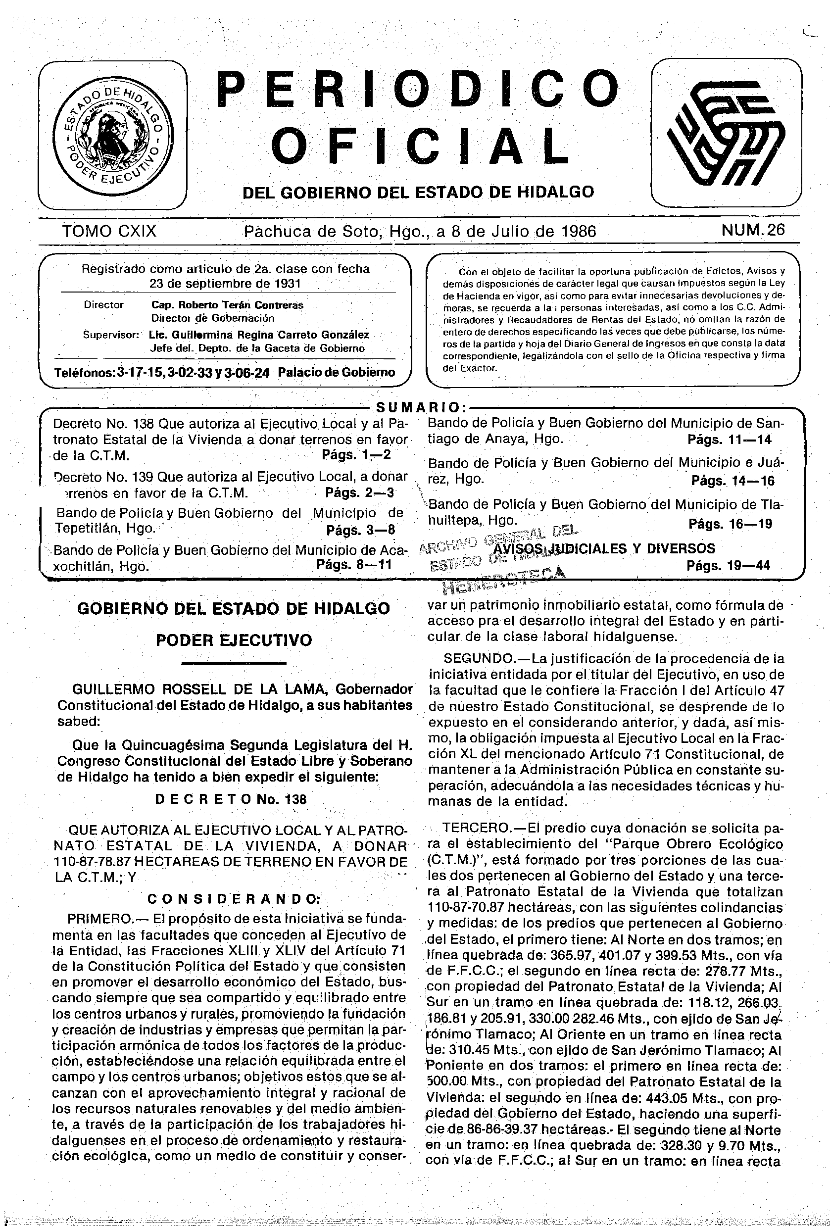 - Decreto No. 138 Que autoriza al Ejecutivo Local y al Patronato Estatal de la Vivienda a donar terrenos a favor de la C.T.M.