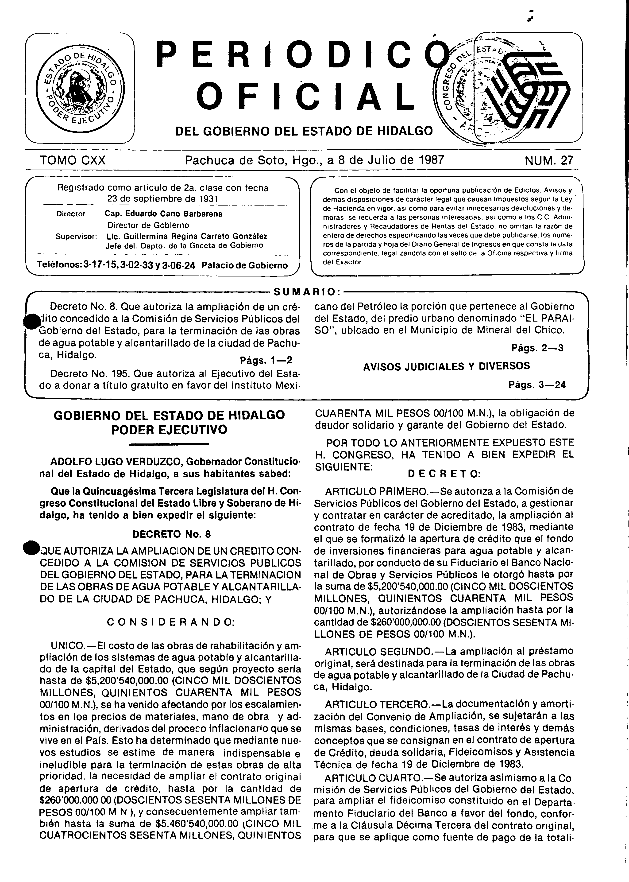 Descargar Periódico Oficial Ordinario 0 del 08 de julio de 1987