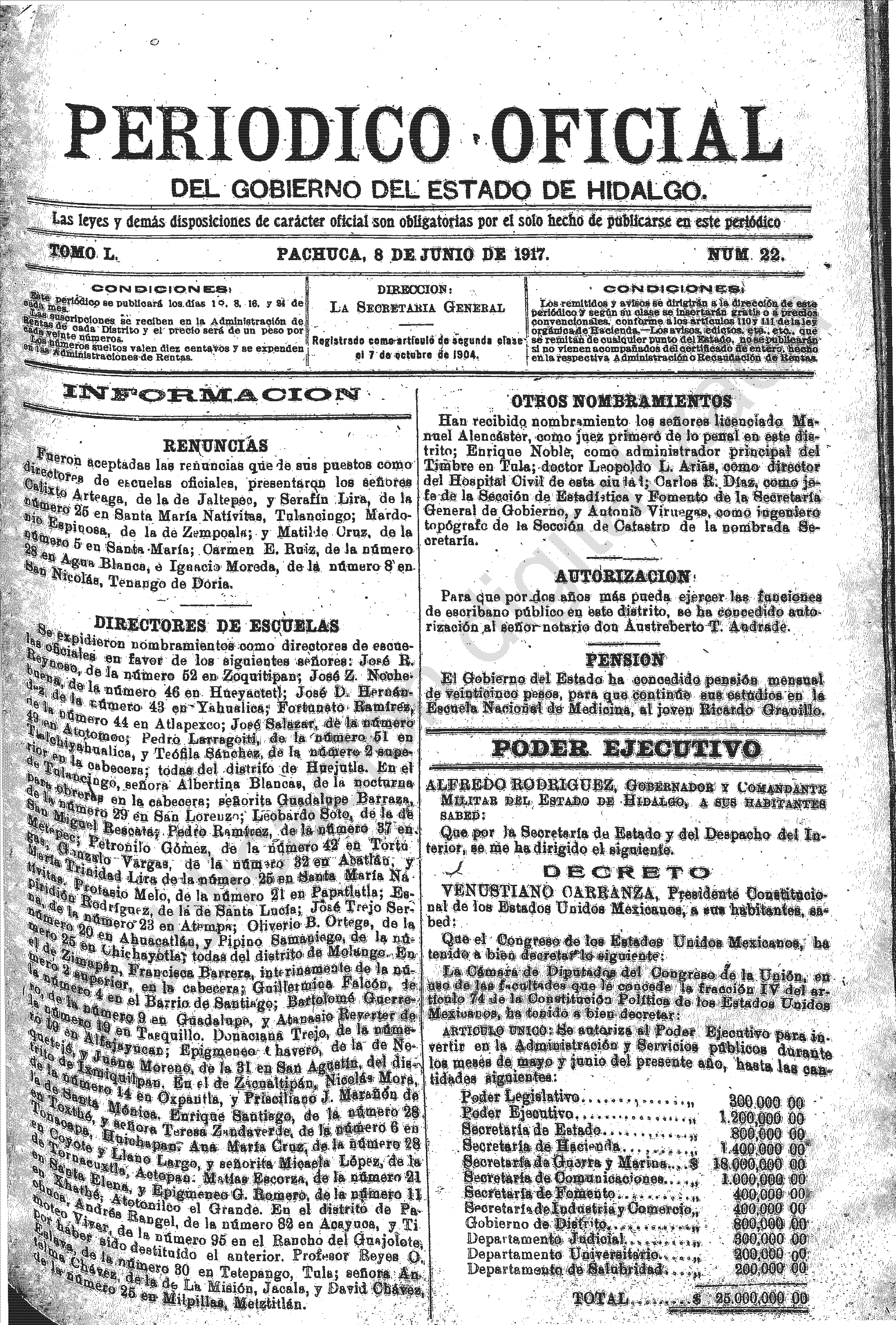 - Venustiano Carranza, Presidente Constitucional de los Estados Unidos Mexicanos, decreto por el que se autoriza al Poder Ejecutivo para invertir en la Administración y Servicios públicos durante los meses de mayo y junio del presente año.